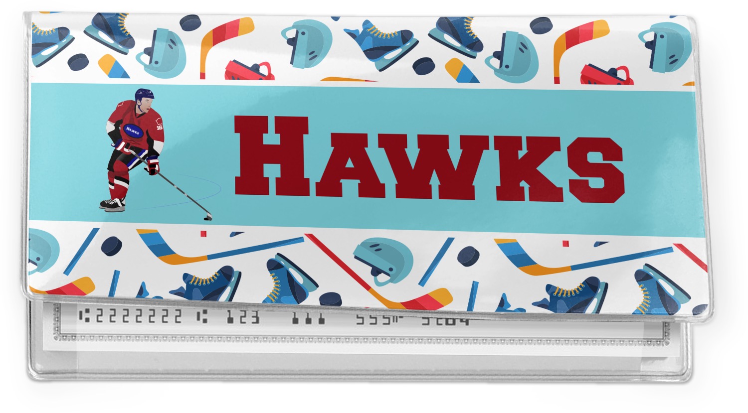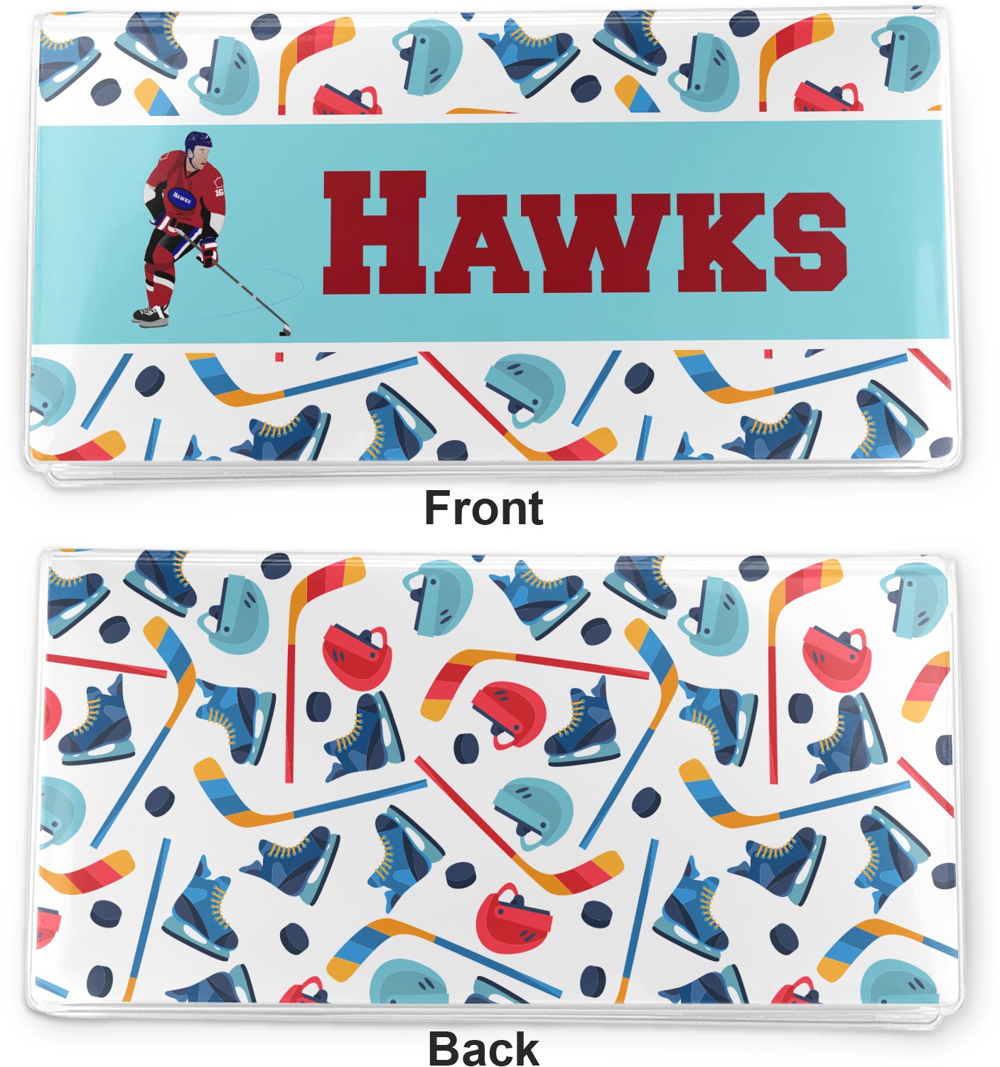 The main design has a fun background with illustrated hockey equipment including a helmet, hockey puck, skate, and hockey sticks. Going through the middle of the design is a solid strip of light teal with a graphic of a hockey player alongside a team name. The coordinating design uses this solid teal background with a hockey stick graphic and personalization.