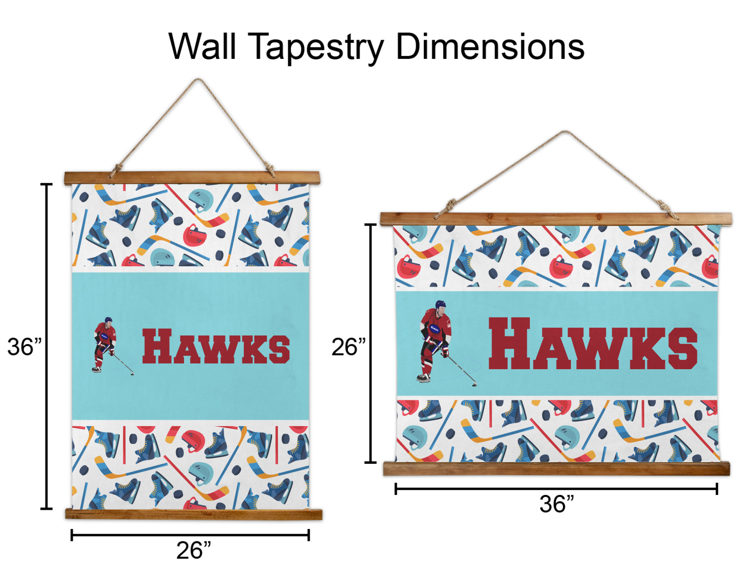 Made in two different orientations - portrait or landscape - both are 26" x 36". Your design is printed on a high quality polyester fabric with hemmed edges. The wood on the top and bottom of the tapestry is 1.25" tall and 0.25" thick and there are two pieces on top and bottom which sandwich the fabric.