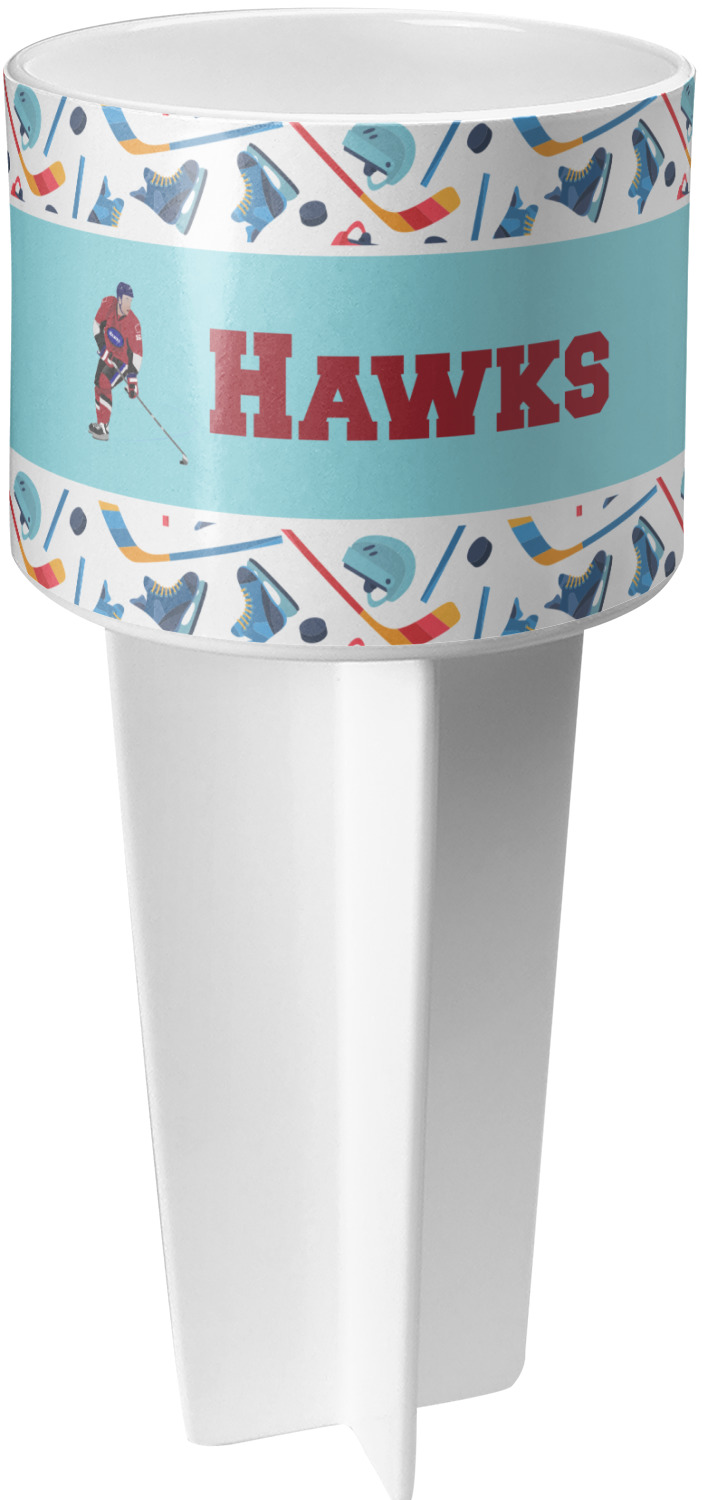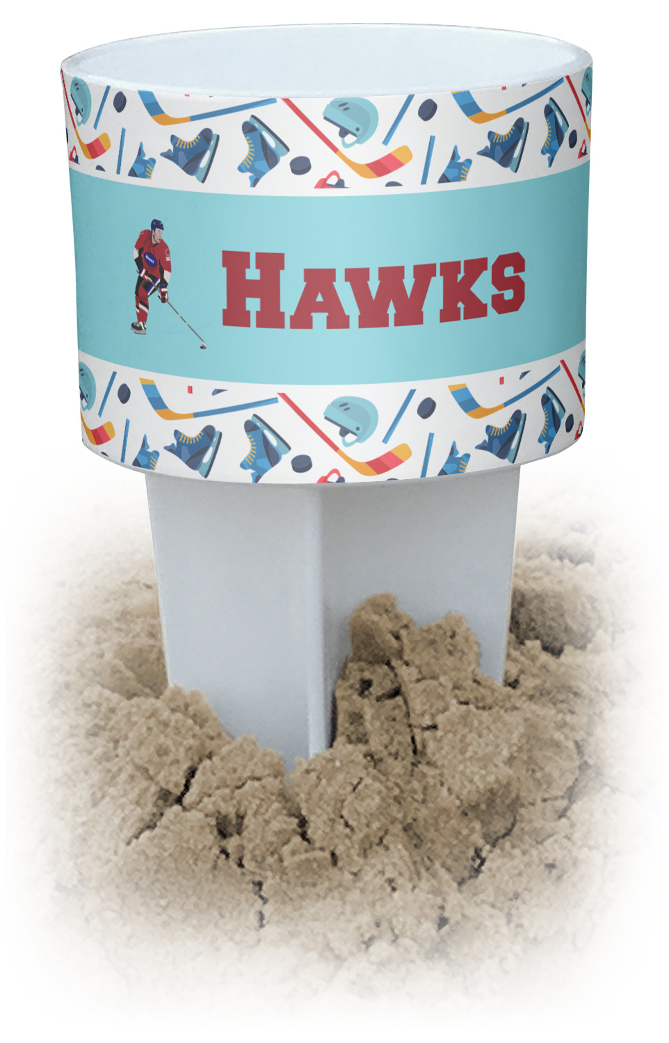 This cup holder has a large stake at its bottom that anchors it to the sand or ground below, while the cup holder rests above the stake. The entire drink holder is made of durable plastic and displays your customization around the cup holder portion. We sell these personalized beach spikers in two different colors: black and white.