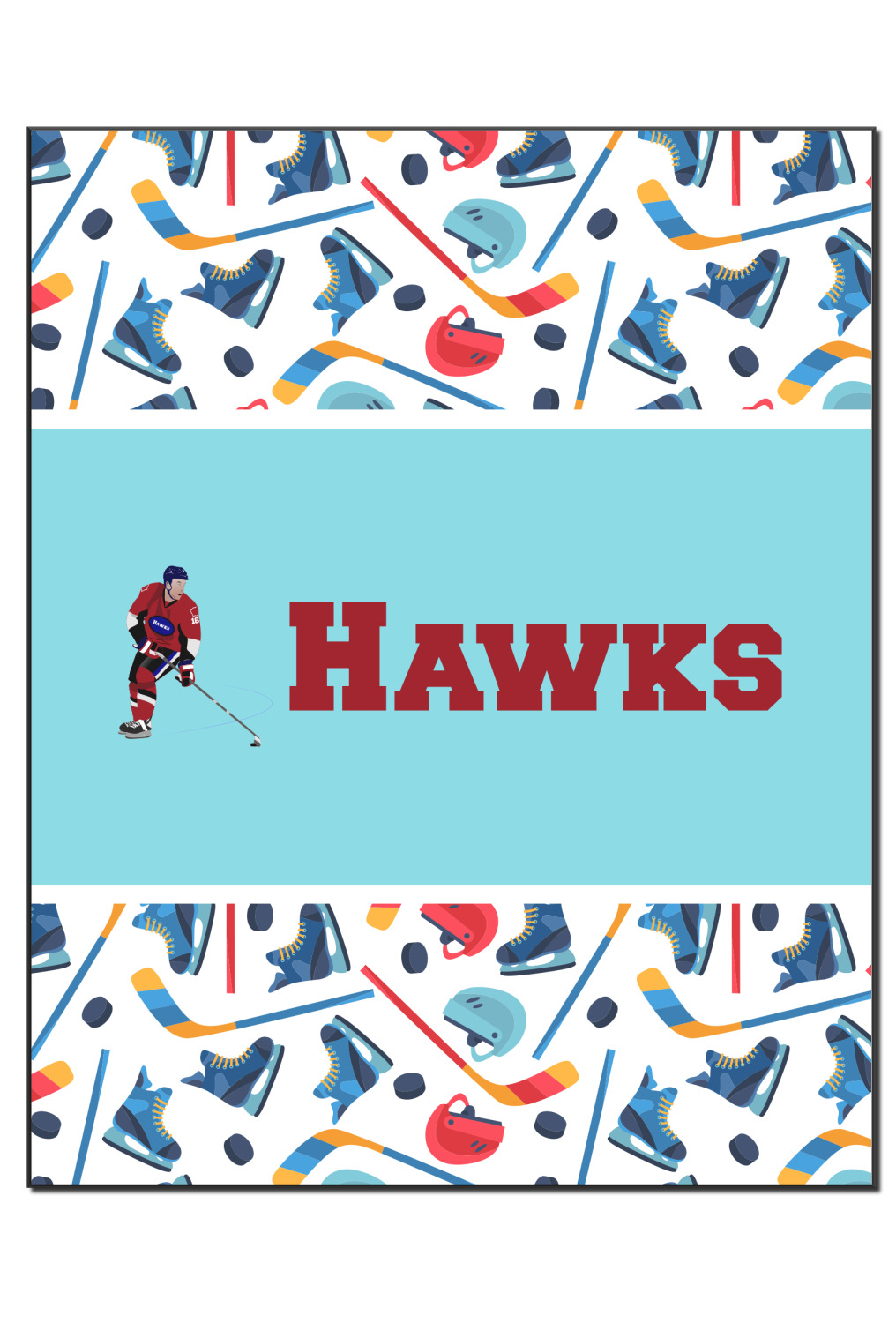 The main design has a fun background with illustrated hockey equipment including a helmet, hockey puck, skate, and hockey sticks. Going through the middle of the design is a solid strip of light teal with a graphic of a hockey player alongside a team name. The coordinating design uses this solid teal background with a hockey stick graphic and personalization.