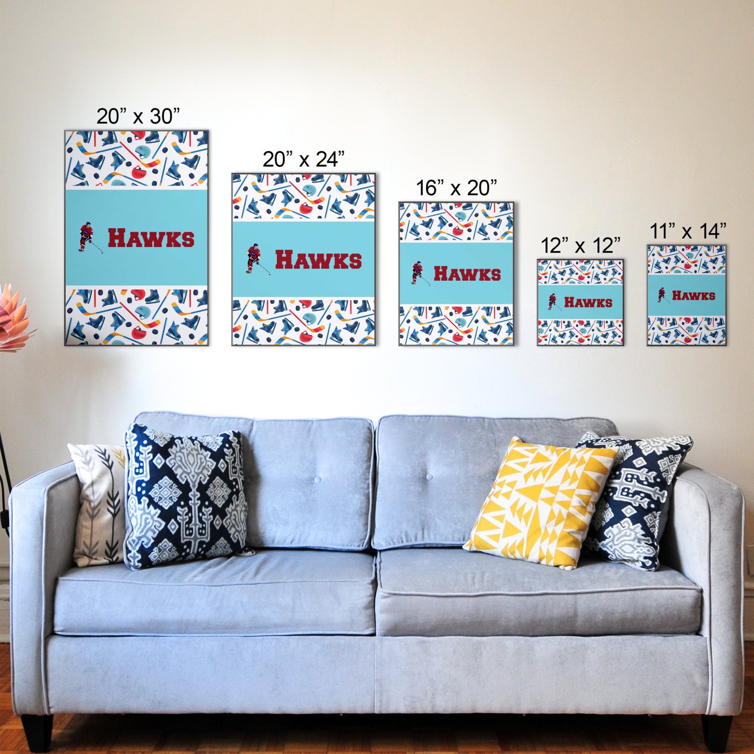 The main design has a fun background with illustrated hockey equipment including a helmet, hockey puck, skate, and hockey sticks. Going through the middle of the design is a solid strip of light teal with a graphic of a hockey player alongside a team name. The coordinating design uses this solid teal background with a hockey stick graphic and personalization.