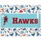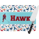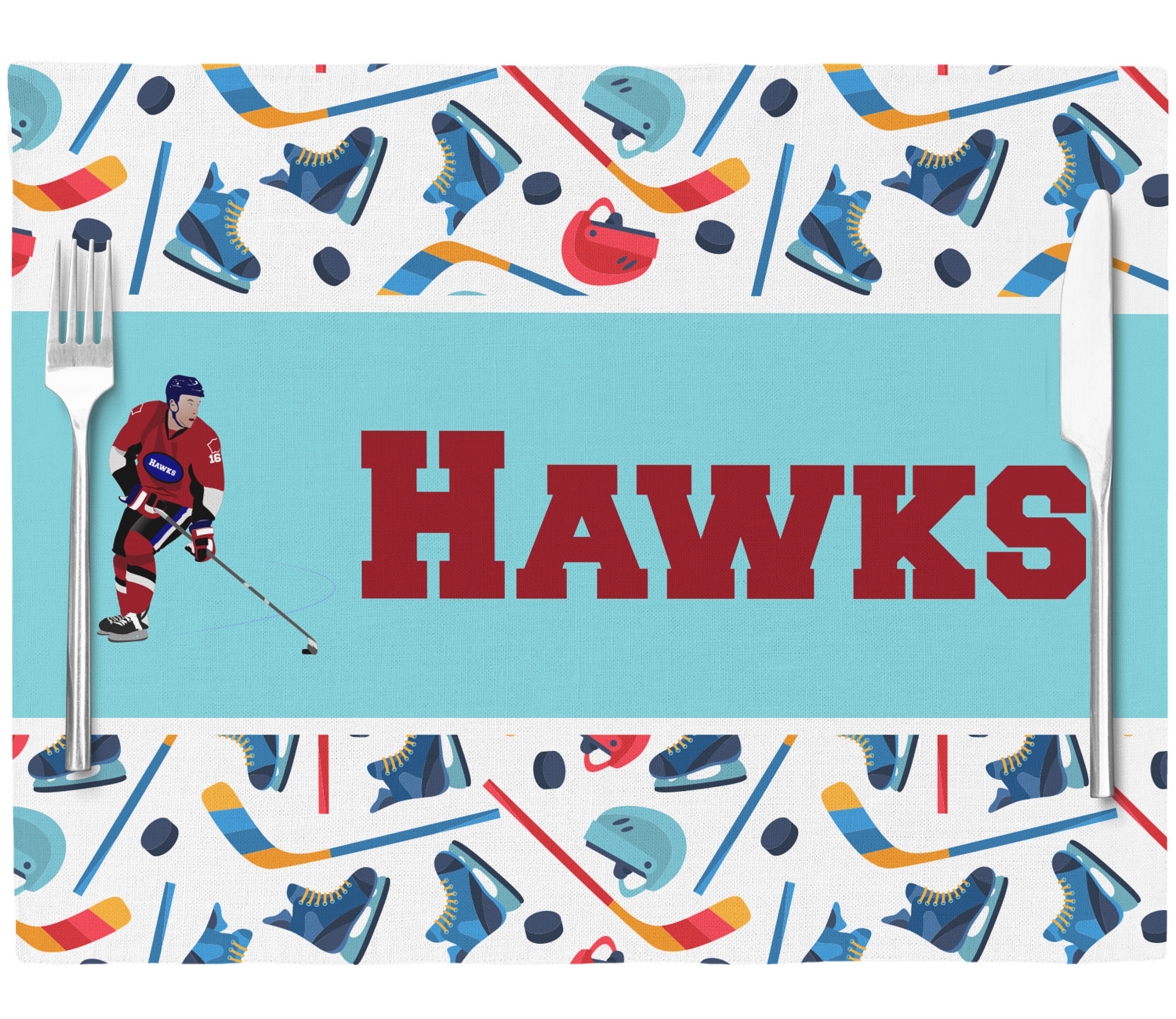 The main design has a fun background with illustrated hockey equipment including a helmet, hockey puck, skate, and hockey sticks. Going through the middle of the design is a solid strip of light teal with a graphic of a hockey player alongside a team name. The coordinating design uses this solid teal background with a hockey stick graphic and personalization.