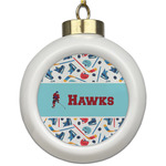 The main design has a fun background with illustrated hockey equipment including a helmet, hockey puck, skate, and hockey sticks. Going through the middle of the design is a solid strip of light teal with a graphic of a hockey player alongside a team name. The coordinating design uses this solid teal background with a hockey stick graphic and personalization.