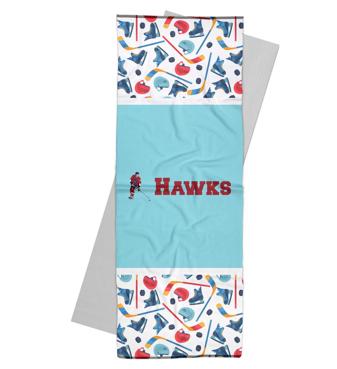The main design has a fun background with illustrated hockey equipment including a helmet, hockey puck, skate, and hockey sticks. Going through the middle of the design is a solid strip of light teal with a graphic of a hockey player alongside a team name. The coordinating design uses this solid teal background with a hockey stick graphic and personalization.