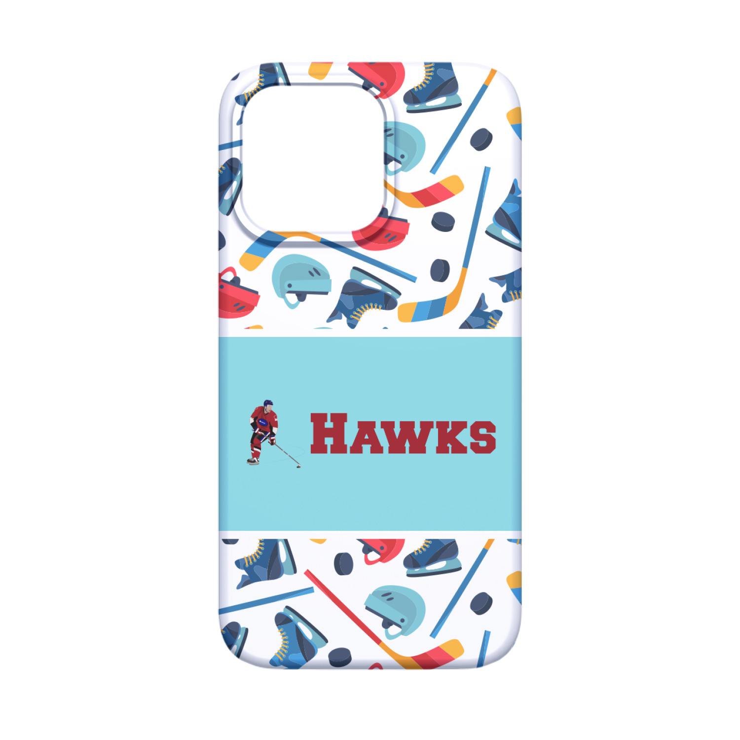 The main design has a fun background with illustrated hockey equipment including a helmet, hockey puck, skate, and hockey sticks. Going through the middle of the design is a solid strip of light teal with a graphic of a hockey player alongside a team name. The coordinating design uses this solid teal background with a hockey stick graphic and personalization.