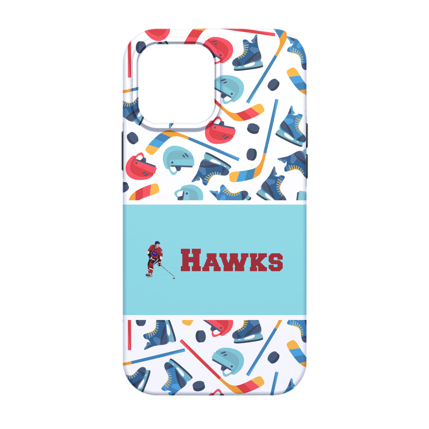 The main design has a fun background with illustrated hockey equipment including a helmet, hockey puck, skate, and hockey sticks. Going through the middle of the design is a solid strip of light teal with a graphic of a hockey player alongside a team name. The coordinating design uses this solid teal background with a hockey stick graphic and personalization.