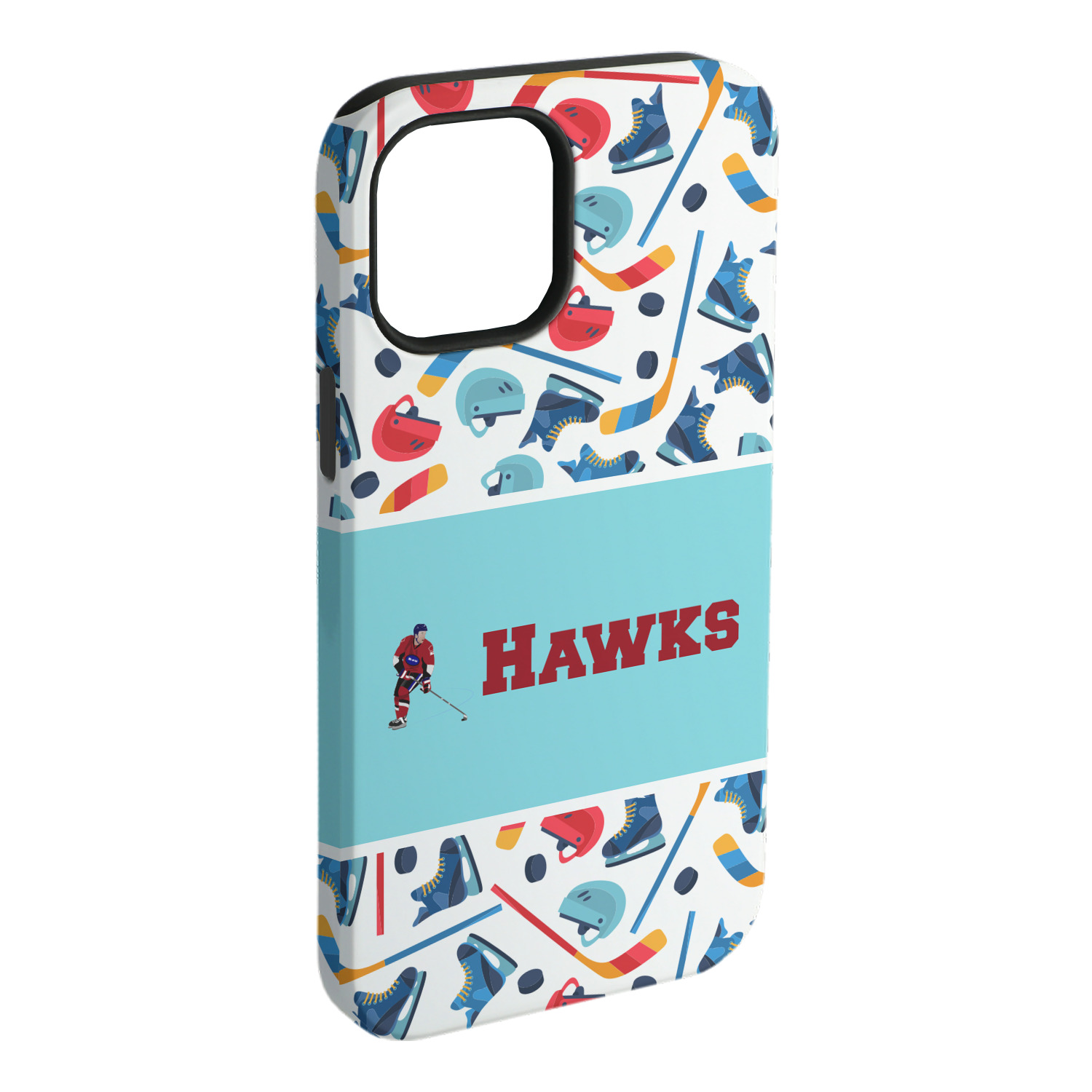 The main design has a fun background with illustrated hockey equipment including a helmet, hockey puck, skate, and hockey sticks. Going through the middle of the design is a solid strip of light teal with a graphic of a hockey player alongside a team name. The coordinating design uses this solid teal background with a hockey stick graphic and personalization.