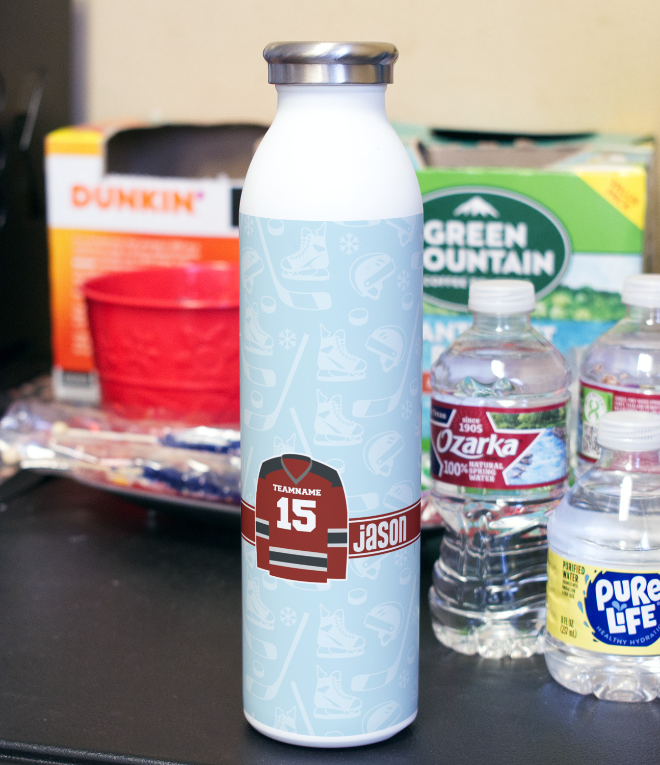 This design features a white background, reminiscent of ice, with hockey pucks repeating on it. The main design has a red hockey jersey in the foreground that can be customized with your favorite team's colors. This design perfect for any die-hard hockey fans!