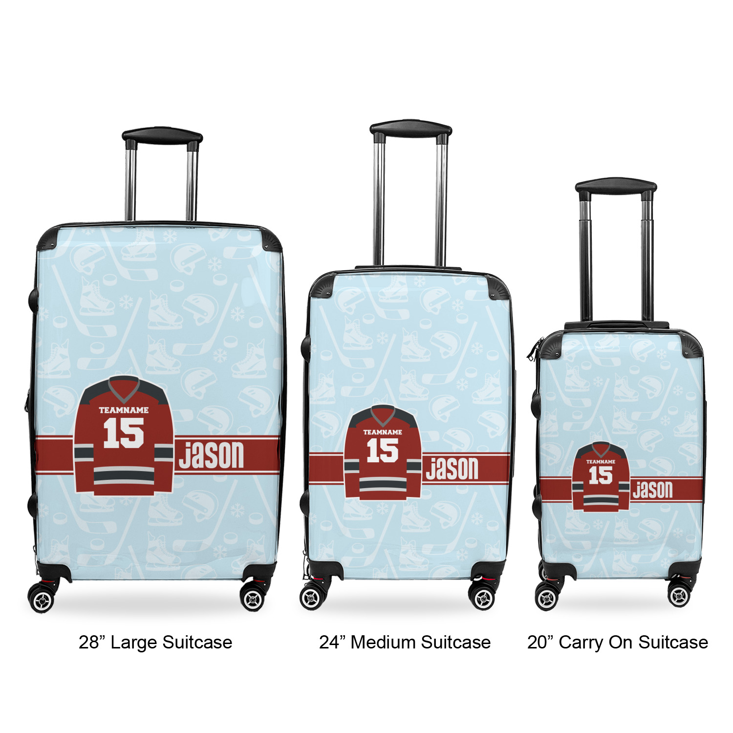 Your suitcases will be personalized on the front, while the back and sides are a sleek charcoal color. On the side opposite of the side handle there are rubber feet to allow it to safely lay on its side on a luggage belt. These are a lightweight hard shell luggage option that will fit just about anyone's needs. The sizes and weights of each suitcase are below: