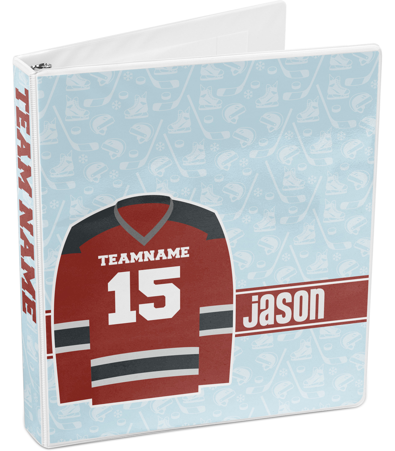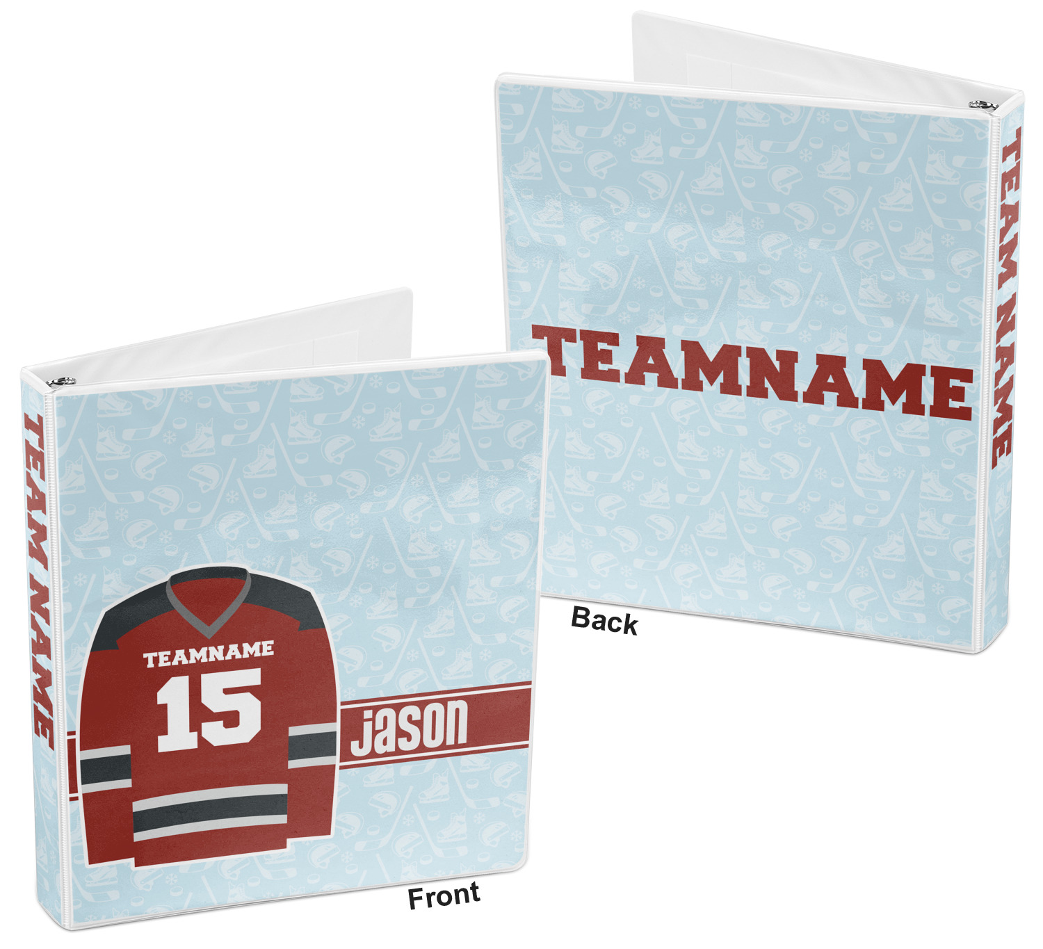 This design features a white background, reminiscent of ice, with hockey pucks repeating on it. The main design has a red hockey jersey in the foreground that can be customized with your favorite team's colors. This design perfect for any die-hard hockey fans!