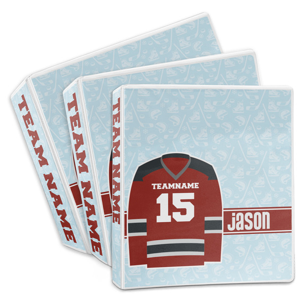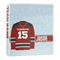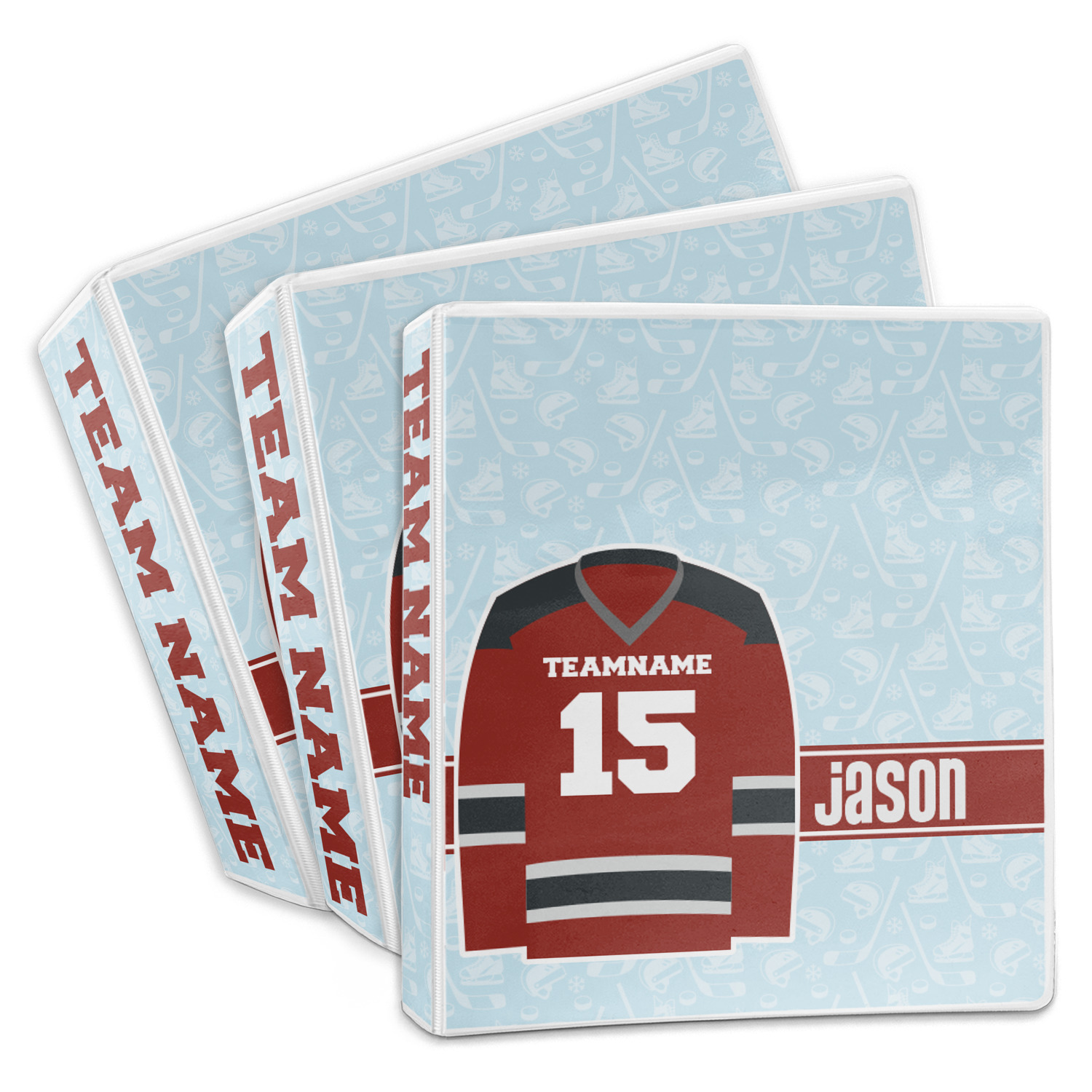 This design features a white background, reminiscent of ice, with hockey pucks repeating on it. The main design has a red hockey jersey in the foreground that can be customized with your favorite team's colors. This design perfect for any die-hard hockey fans!