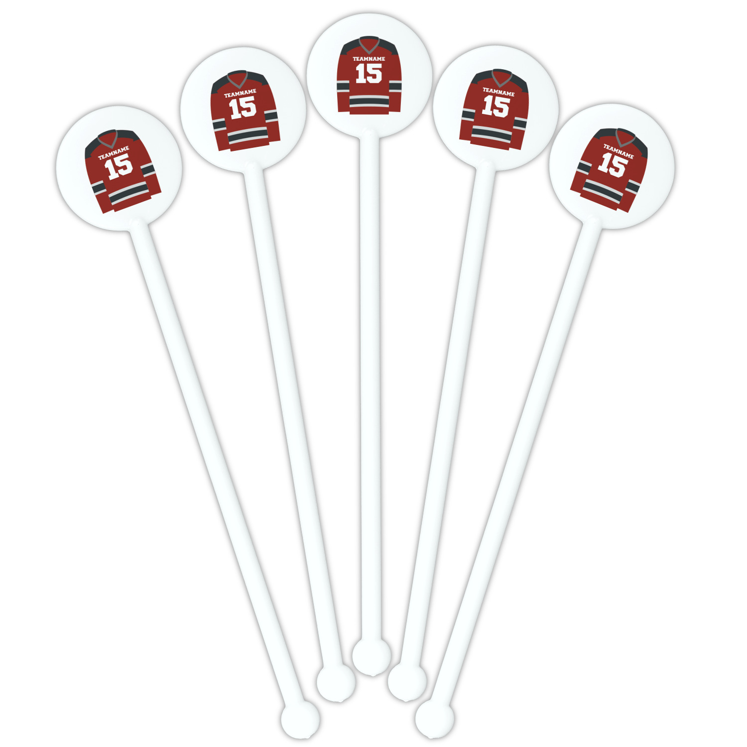 This design features a white background, reminiscent of ice, with hockey pucks repeating on it. The main design has a red hockey jersey in the foreground that can be customized with your favorite team's colors. This design perfect for any die-hard hockey fans!