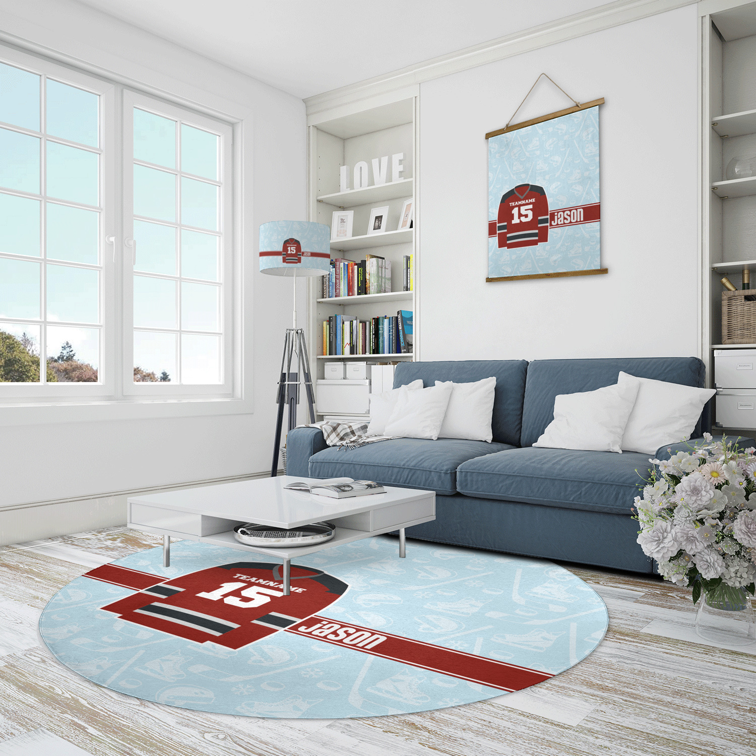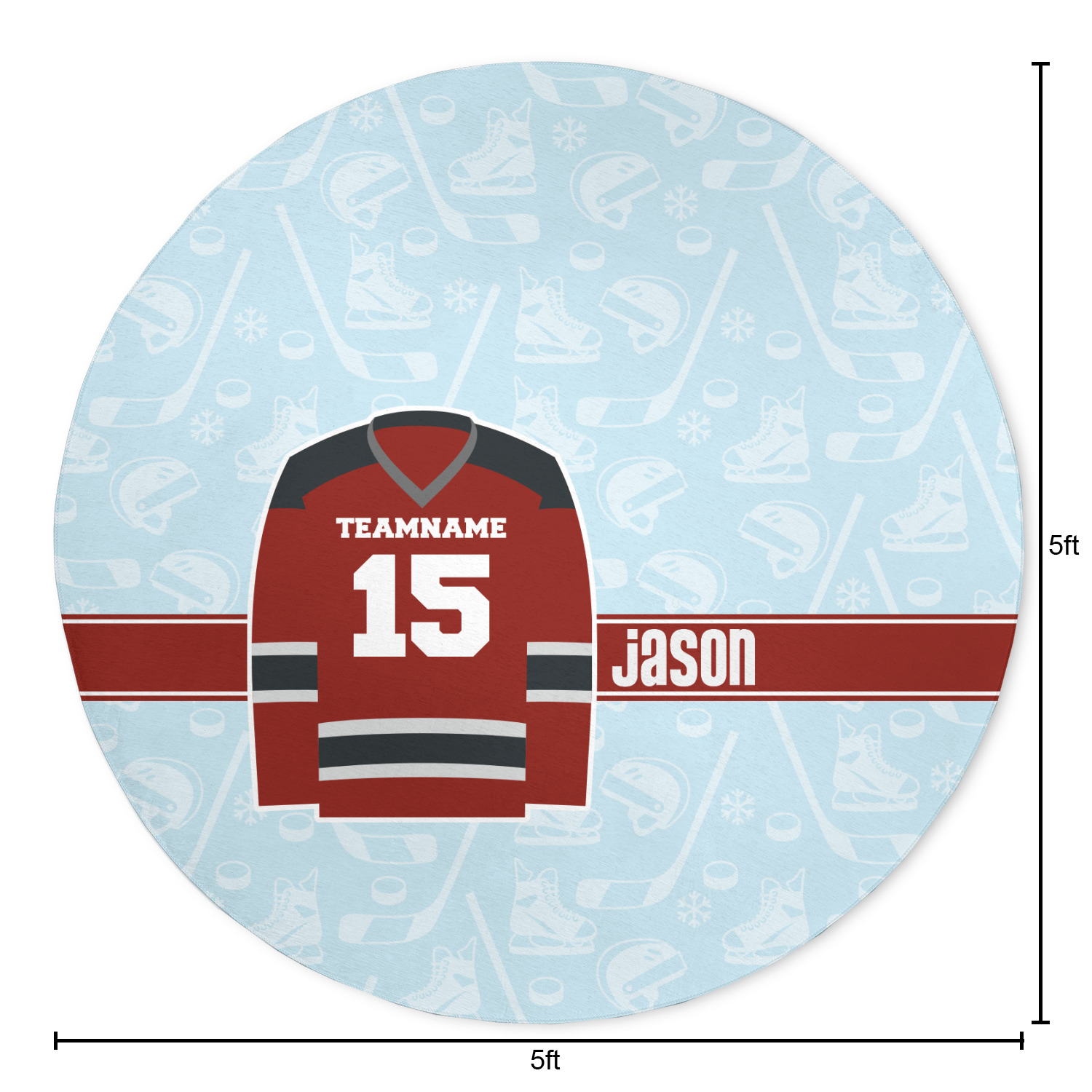 This design features a white background, reminiscent of ice, with hockey pucks repeating on it. The main design has a red hockey jersey in the foreground that can be customized with your favorite team's colors. This design perfect for any die-hard hockey fans!
