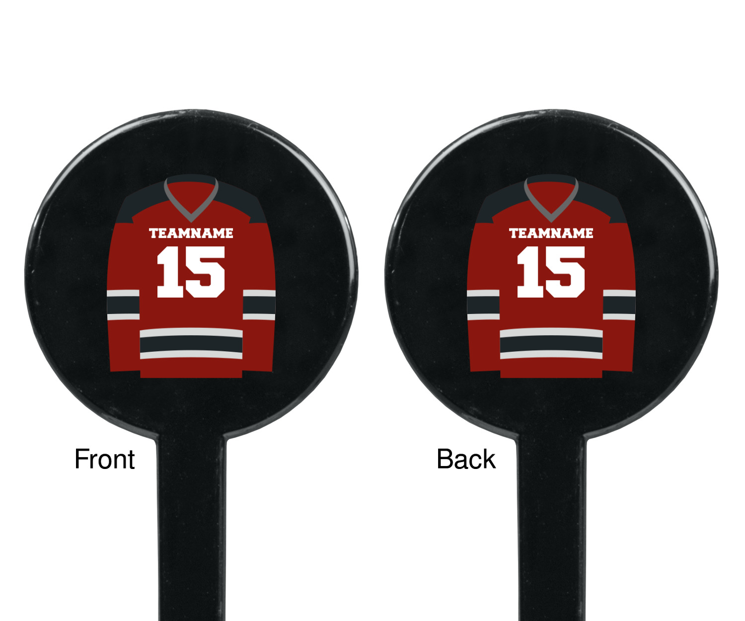 This design features a white background, reminiscent of ice, with hockey pucks repeating on it. The main design has a red hockey jersey in the foreground that can be customized with your favorite team's colors. This design perfect for any die-hard hockey fans!