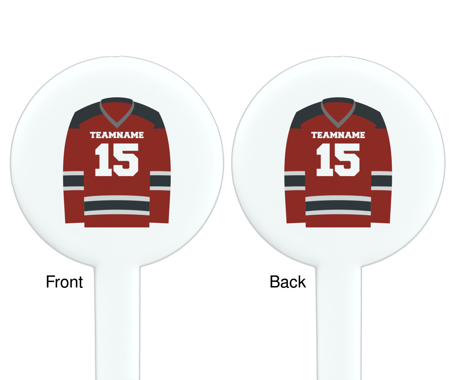 This design features a white background, reminiscent of ice, with hockey pucks repeating on it. The main design has a red hockey jersey in the foreground that can be customized with your favorite team's colors. This design perfect for any die-hard hockey fans!
