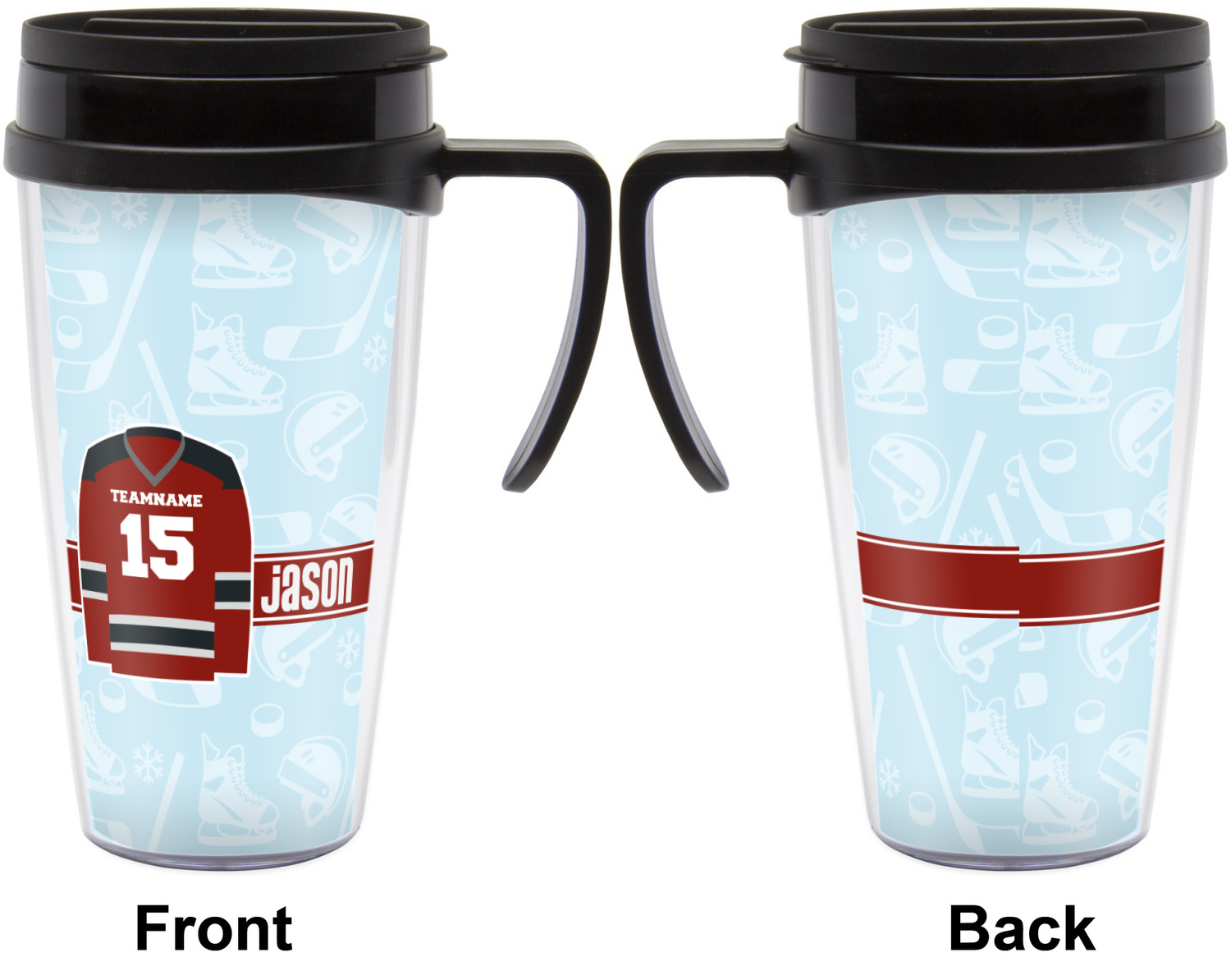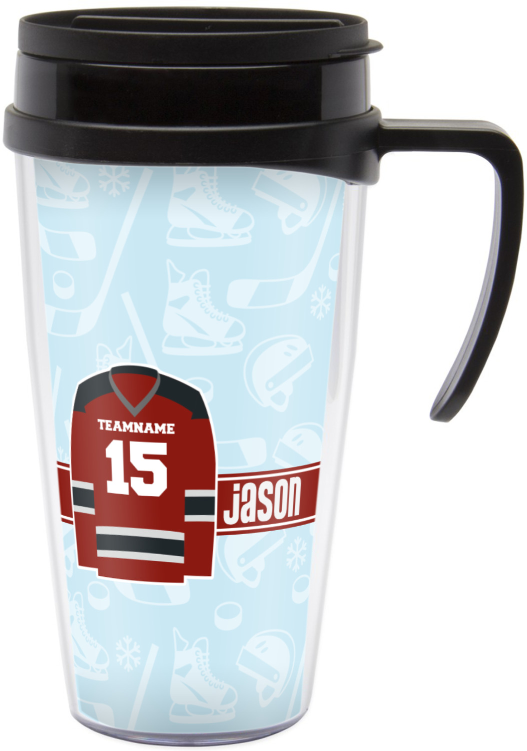 This design features a white background, reminiscent of ice, with hockey pucks repeating on it. The main design has a red hockey jersey in the foreground that can be customized with your favorite team's colors. This design perfect for any die-hard hockey fans!