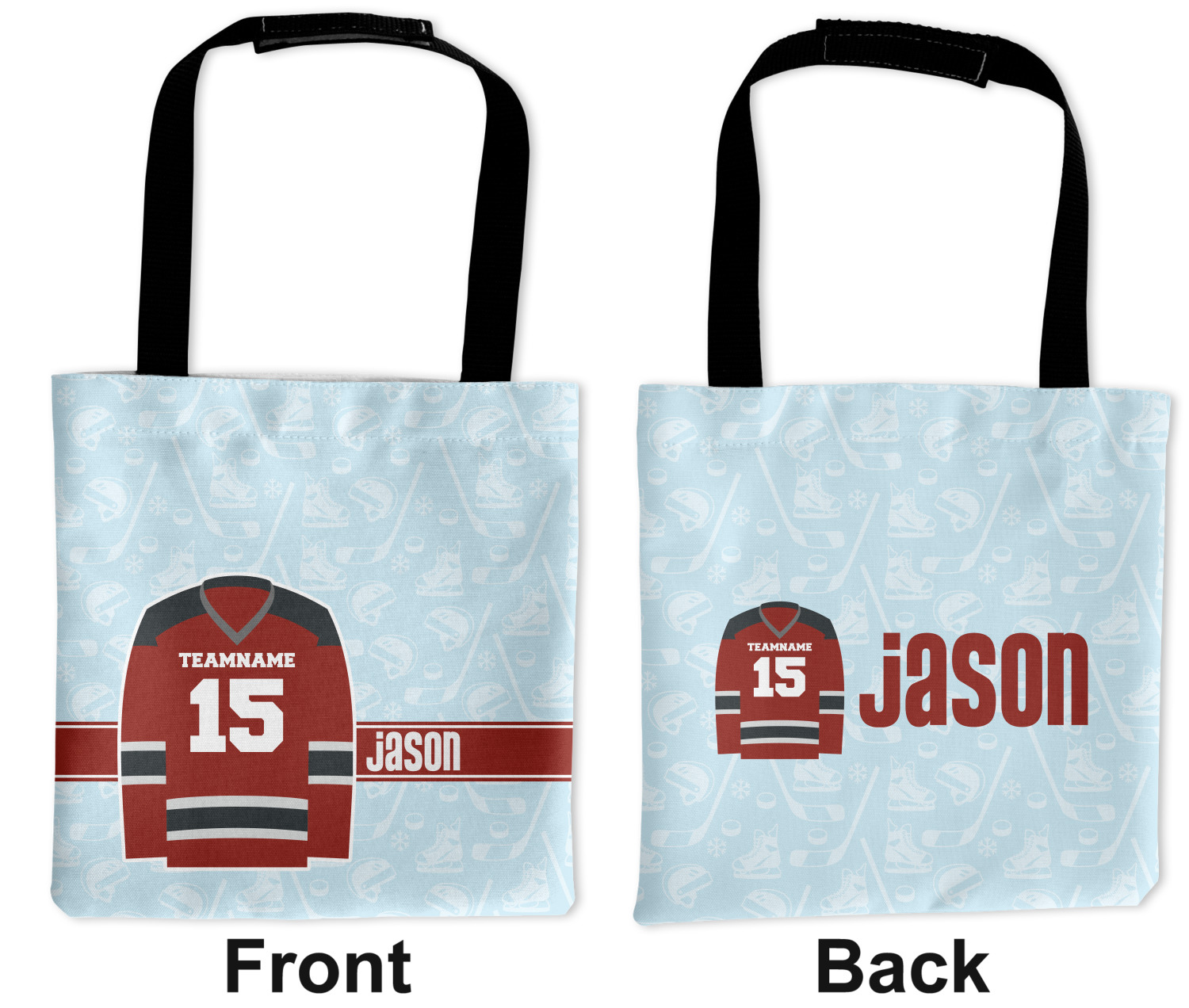 This design features a white background, reminiscent of ice, with hockey pucks repeating on it. The main design has a red hockey jersey in the foreground that can be customized with your favorite team's colors. This design perfect for any die-hard hockey fans!