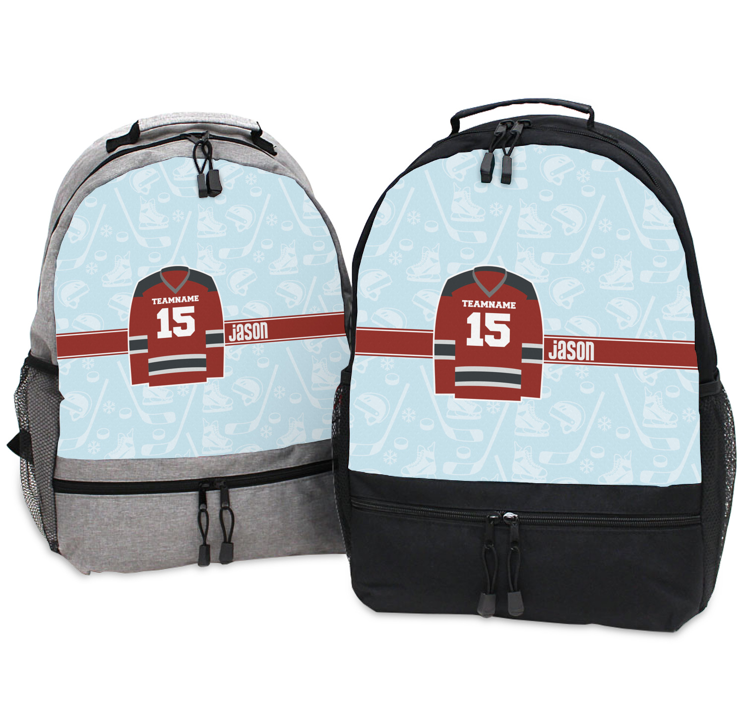 This design features a white background, reminiscent of ice, with hockey pucks repeating on it. The main design has a red hockey jersey in the foreground that can be customized with your favorite team's colors. This design perfect for any die-hard hockey fans!