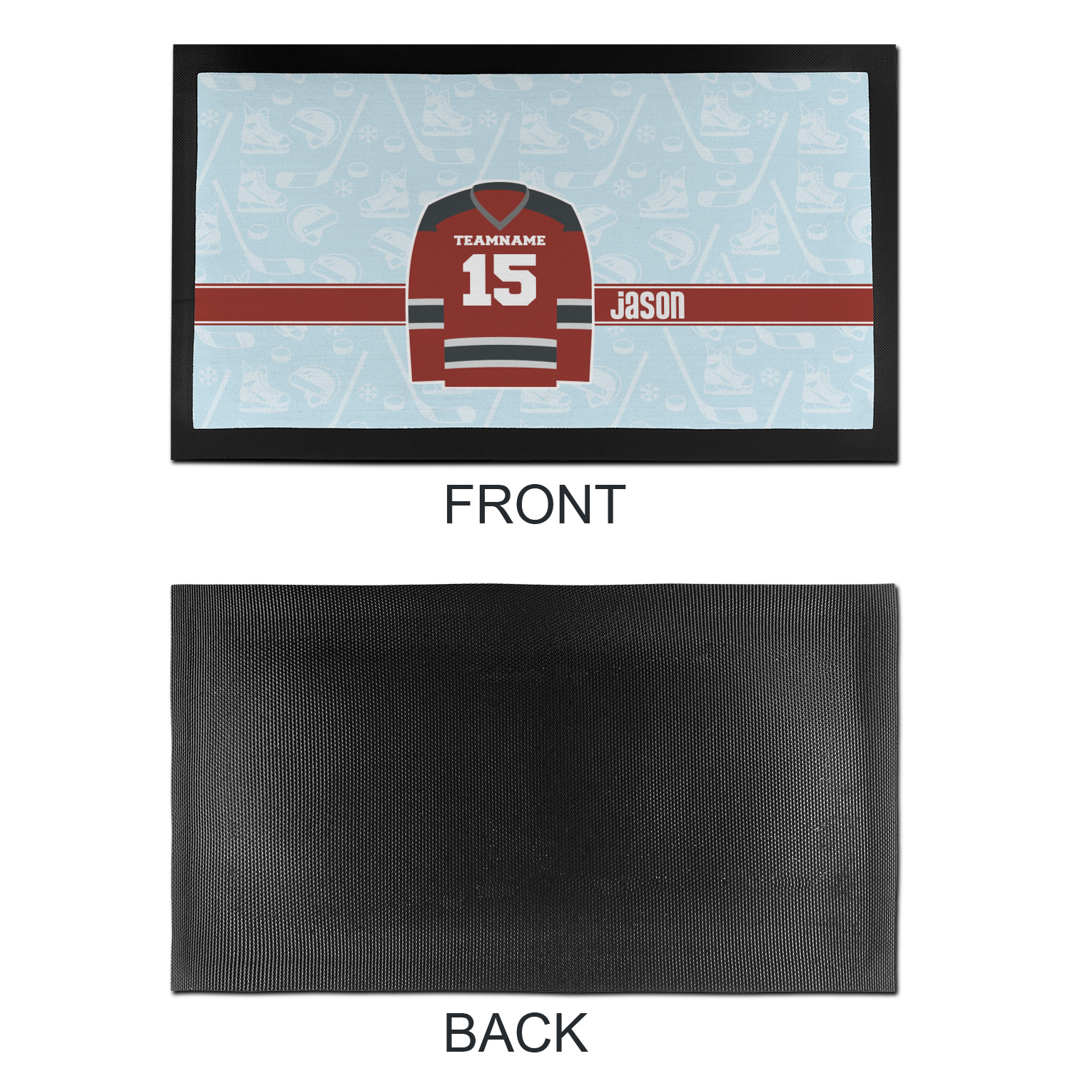 This design features a white background, reminiscent of ice, with hockey pucks repeating on it. The main design has a red hockey jersey in the foreground that can be customized with your favorite team's colors. This design perfect for any die-hard hockey fans!