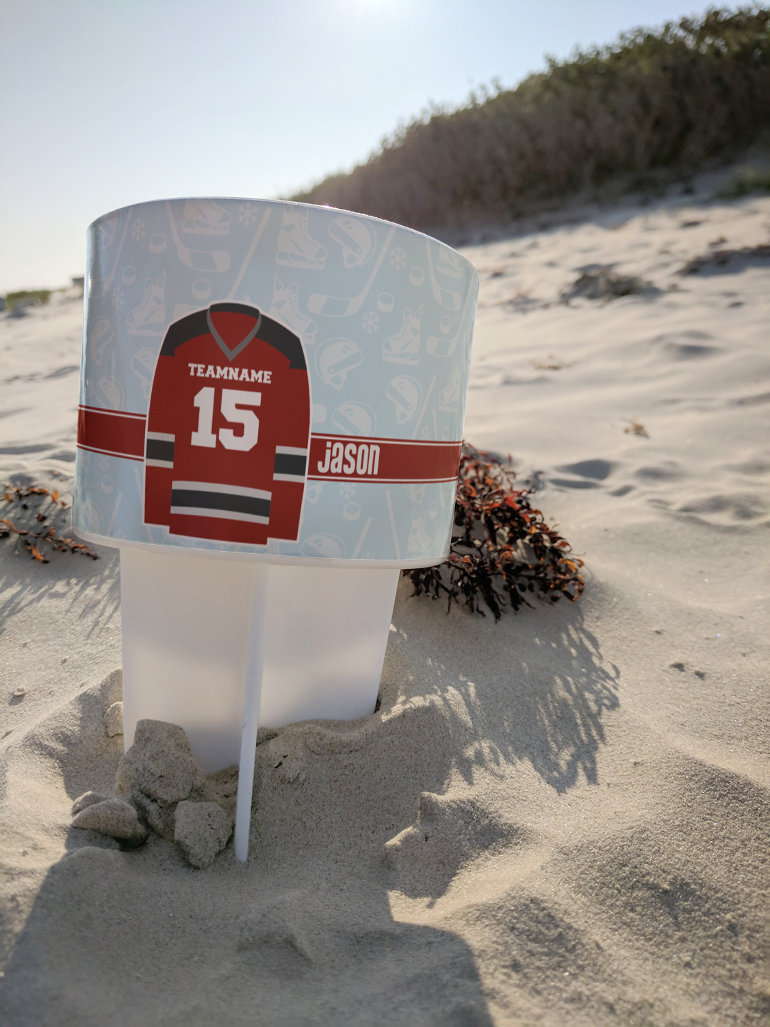 This design features a white background, reminiscent of ice, with hockey pucks repeating on it. The main design has a red hockey jersey in the foreground that can be customized with your favorite team's colors. This design perfect for any die-hard hockey fans!