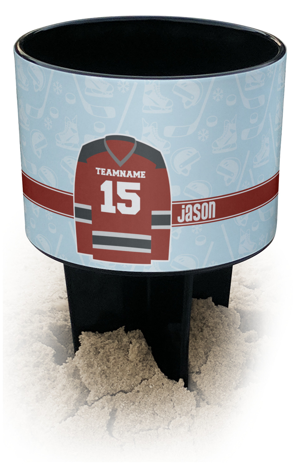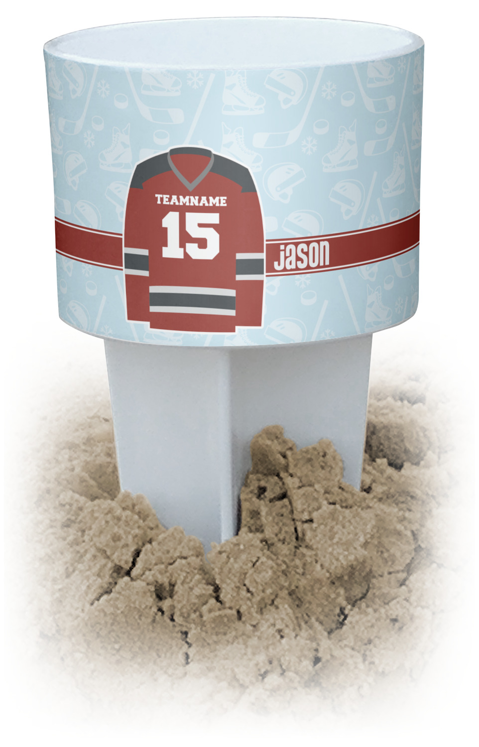 This cup holder has a large stake at its bottom that anchors it to the sand or ground below, while the cup holder rests above the stake. The entire drink holder is made of durable plastic and displays your customization around the cup holder portion. We sell these personalized beach spikers in two different colors: black and white.