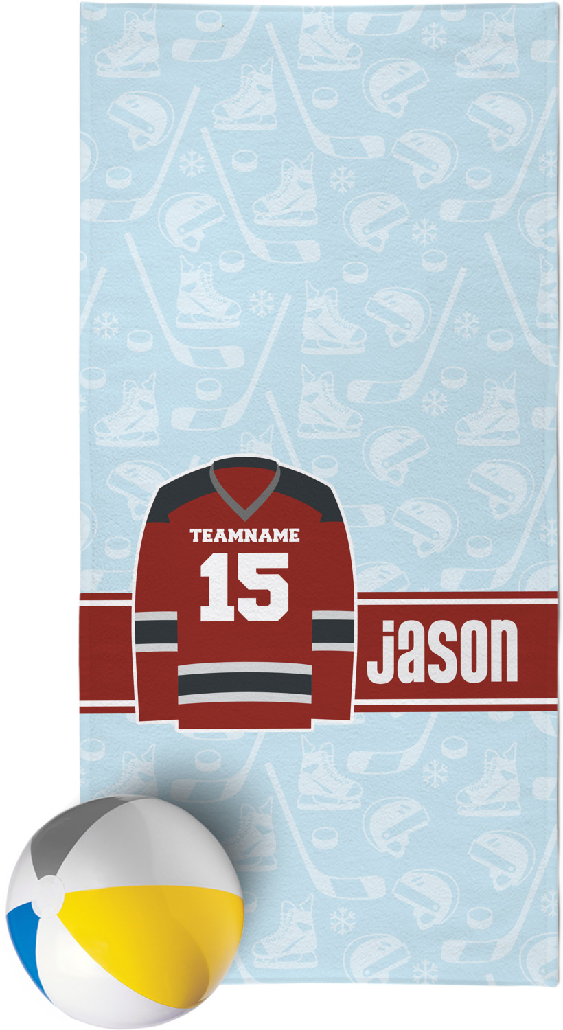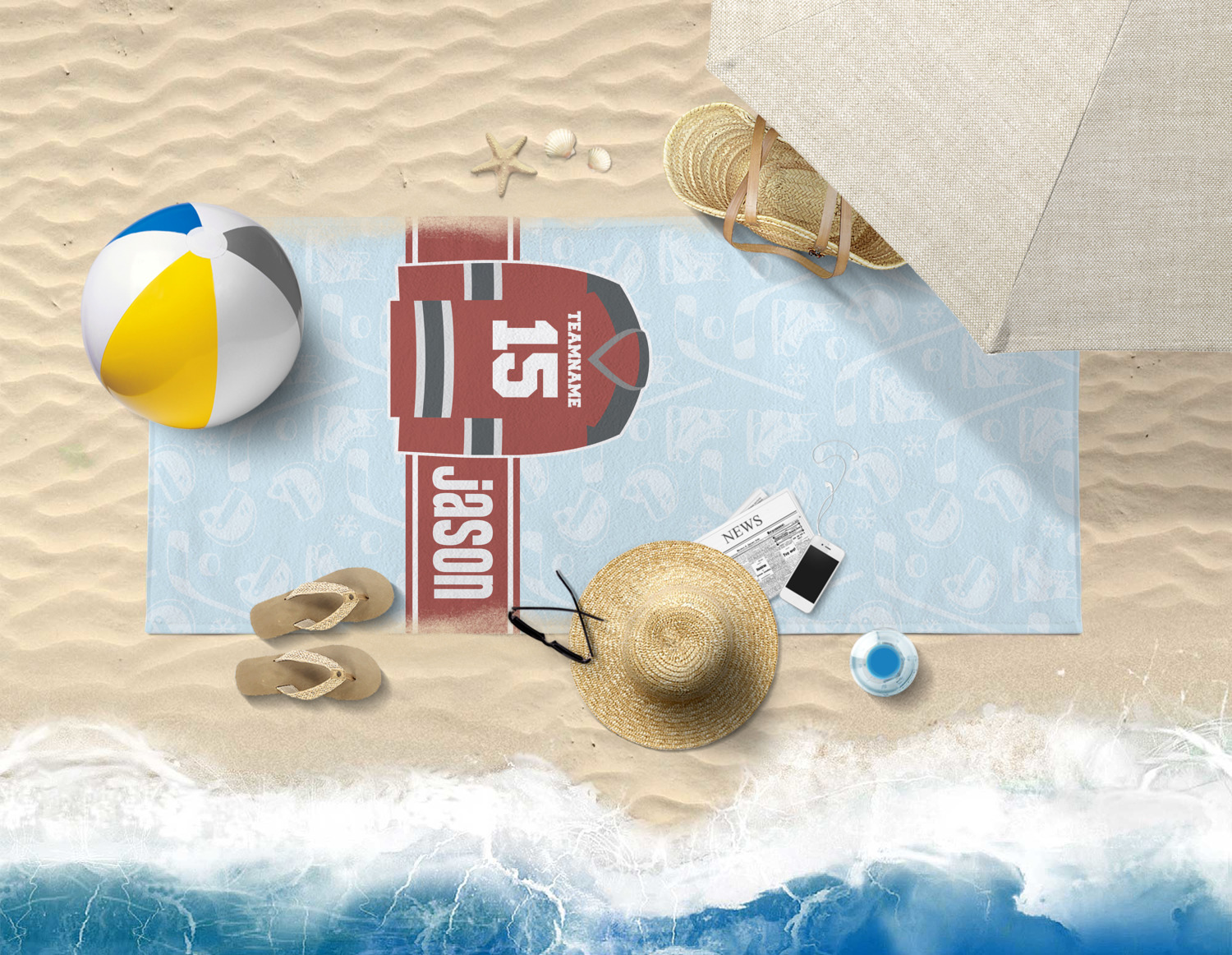 This design features a white background, reminiscent of ice, with hockey pucks repeating on it. The main design has a red hockey jersey in the foreground that can be customized with your favorite team's colors. This design perfect for any die-hard hockey fans!