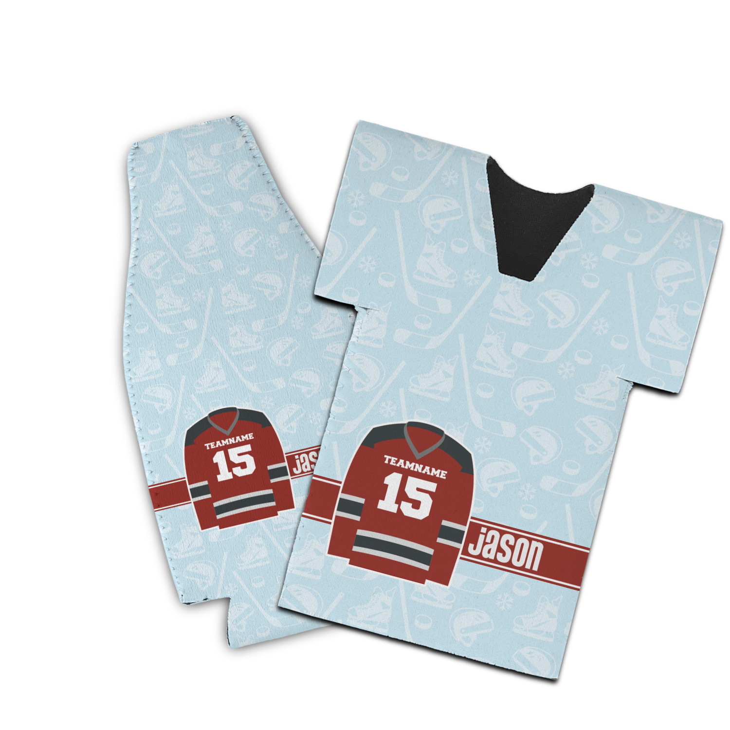 This design features a white background, reminiscent of ice, with hockey pucks repeating on it. The main design has a red hockey jersey in the foreground that can be customized with your favorite team's colors. This design perfect for any die-hard hockey fans!