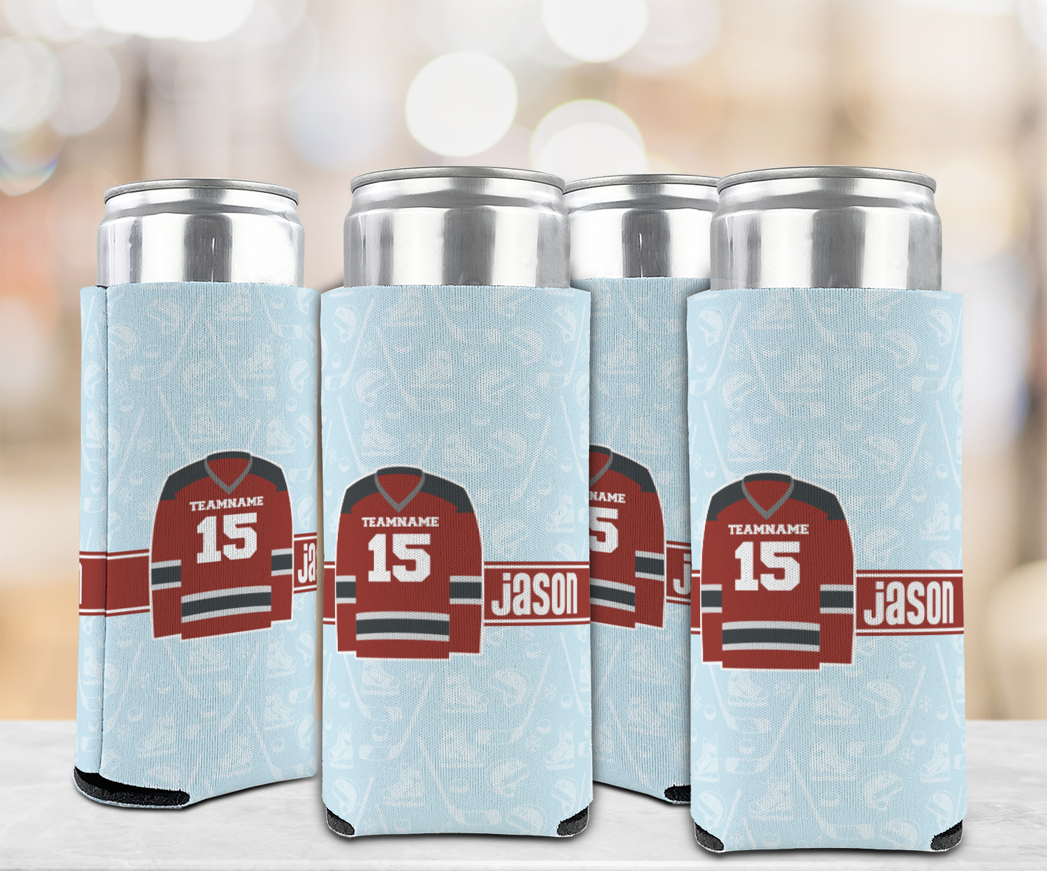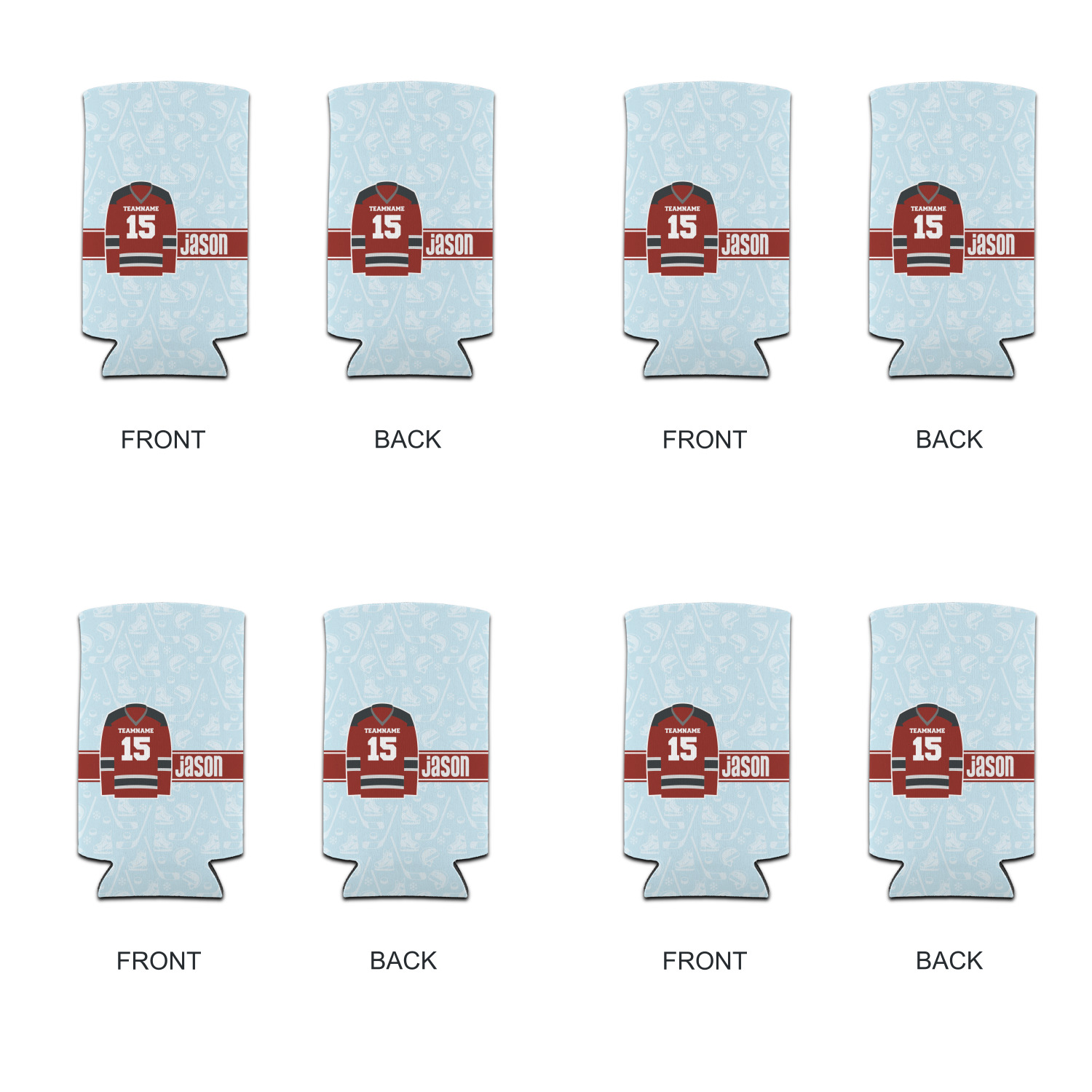 This design features a white background, reminiscent of ice, with hockey pucks repeating on it. The main design has a red hockey jersey in the foreground that can be customized with your favorite team's colors. This design perfect for any die-hard hockey fans!