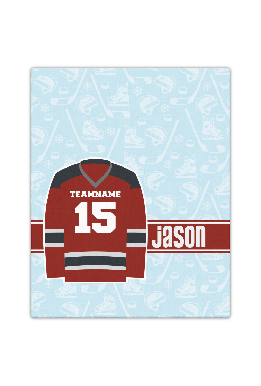 This design features a white background, reminiscent of ice, with hockey pucks repeating on it. The main design has a red hockey jersey in the foreground that can be customized with your favorite team's colors. This design perfect for any die-hard hockey fans!