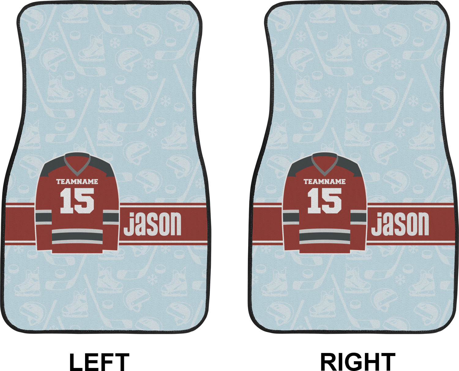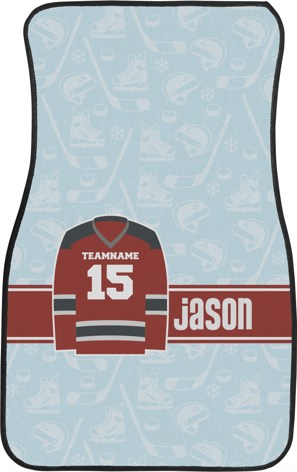 This design features a white background, reminiscent of ice, with hockey pucks repeating on it. The main design has a red hockey jersey in the foreground that can be customized with your favorite team's colors. This design perfect for any die-hard hockey fans!