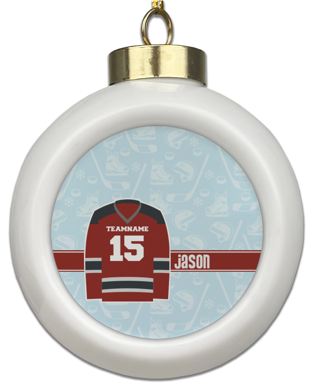 This design features a white background, reminiscent of ice, with hockey pucks repeating on it. The main design has a red hockey jersey in the foreground that can be customized with your favorite team's colors. This design perfect for any die-hard hockey fans!