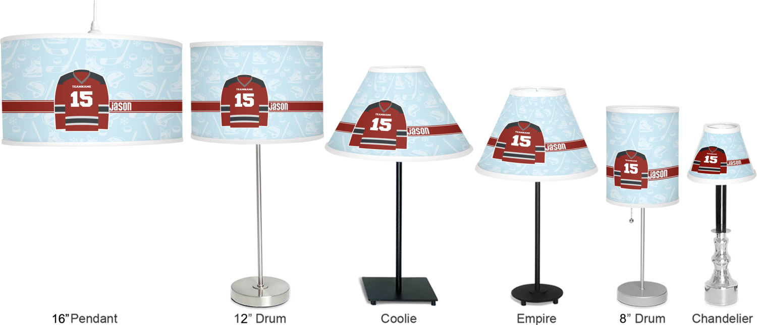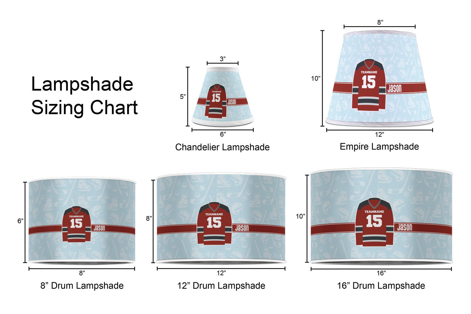 This design features a white background, reminiscent of ice, with hockey pucks repeating on it. The main design has a red hockey jersey in the foreground that can be customized with your favorite team's colors. This design perfect for any die-hard hockey fans!