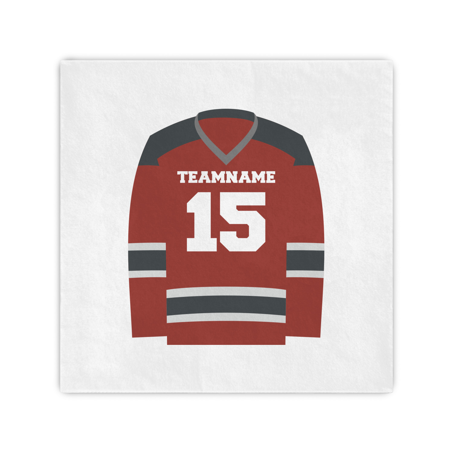 This design features a white background, reminiscent of ice, with hockey pucks repeating on it. The main design has a red hockey jersey in the foreground that can be customized with your favorite team's colors. This design perfect for any die-hard hockey fans!