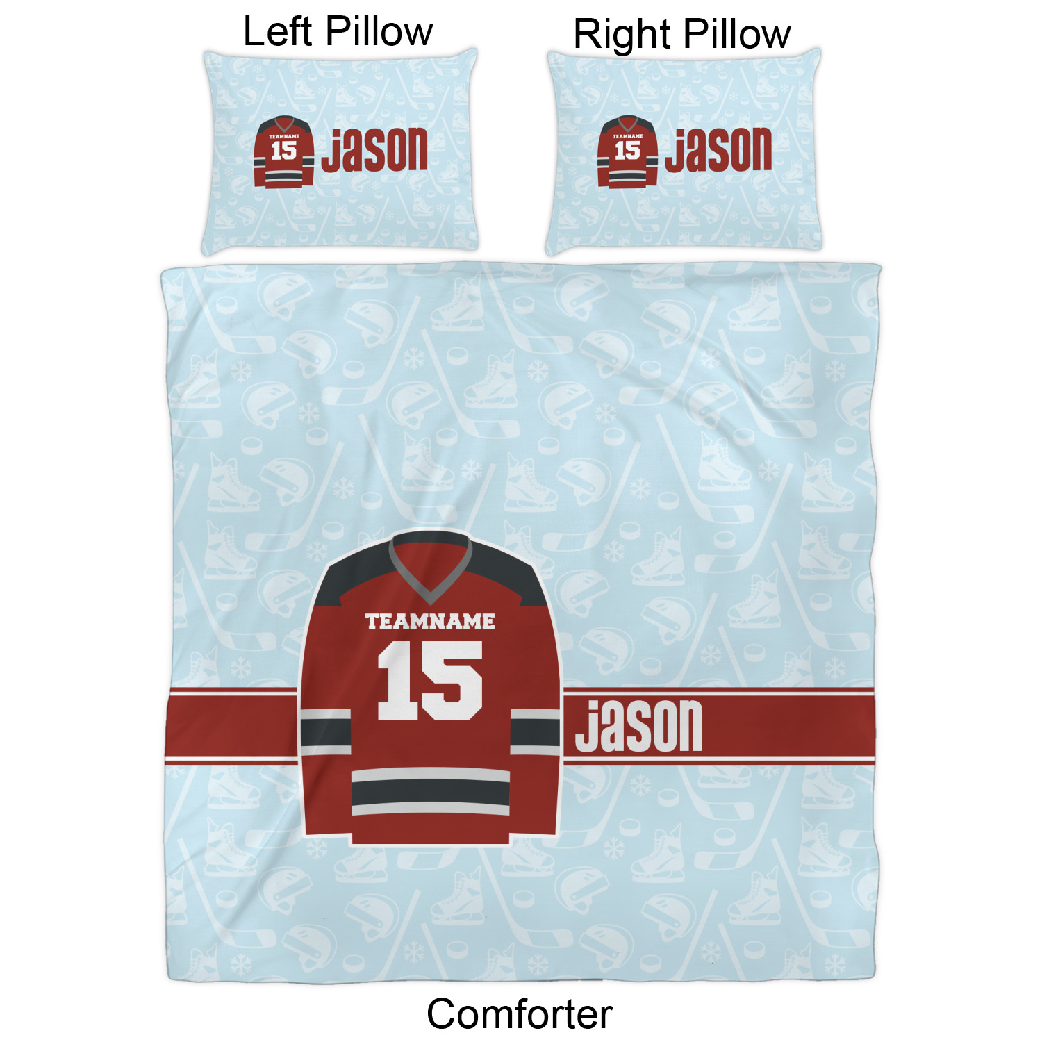 This design features a white background, reminiscent of ice, with hockey pucks repeating on it. The main design has a red hockey jersey in the foreground that can be customized with your favorite team's colors. This design perfect for any die-hard hockey fans!
