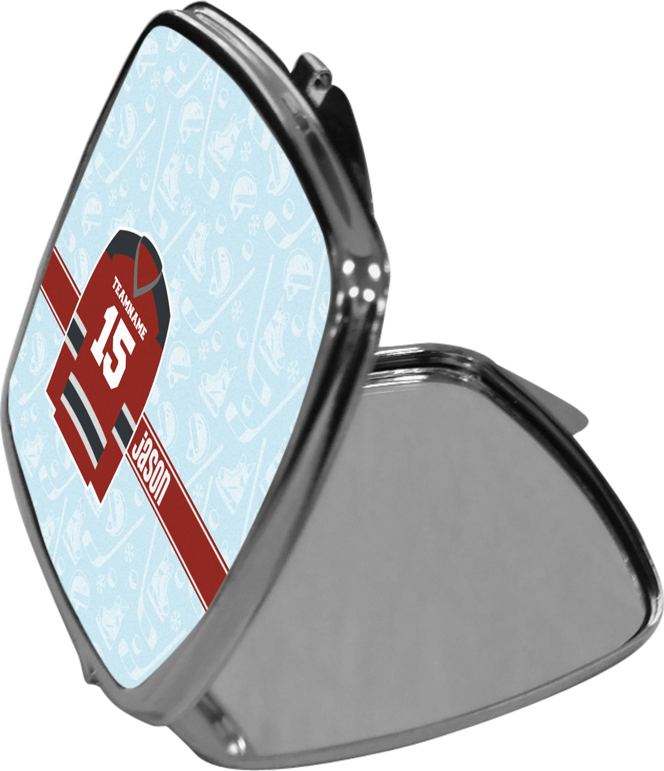 Our compact mirrors are customized with your design on one side. The other side is patterned silver tone metal. Inside, there are two mirrors.