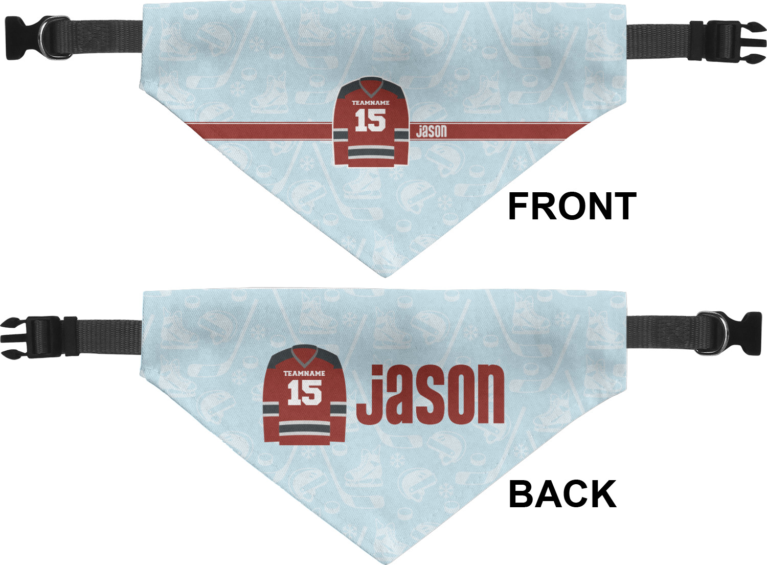 This design features a white background, reminiscent of ice, with hockey pucks repeating on it. The main design has a red hockey jersey in the foreground that can be customized with your favorite team's colors. This design perfect for any die-hard hockey fans!