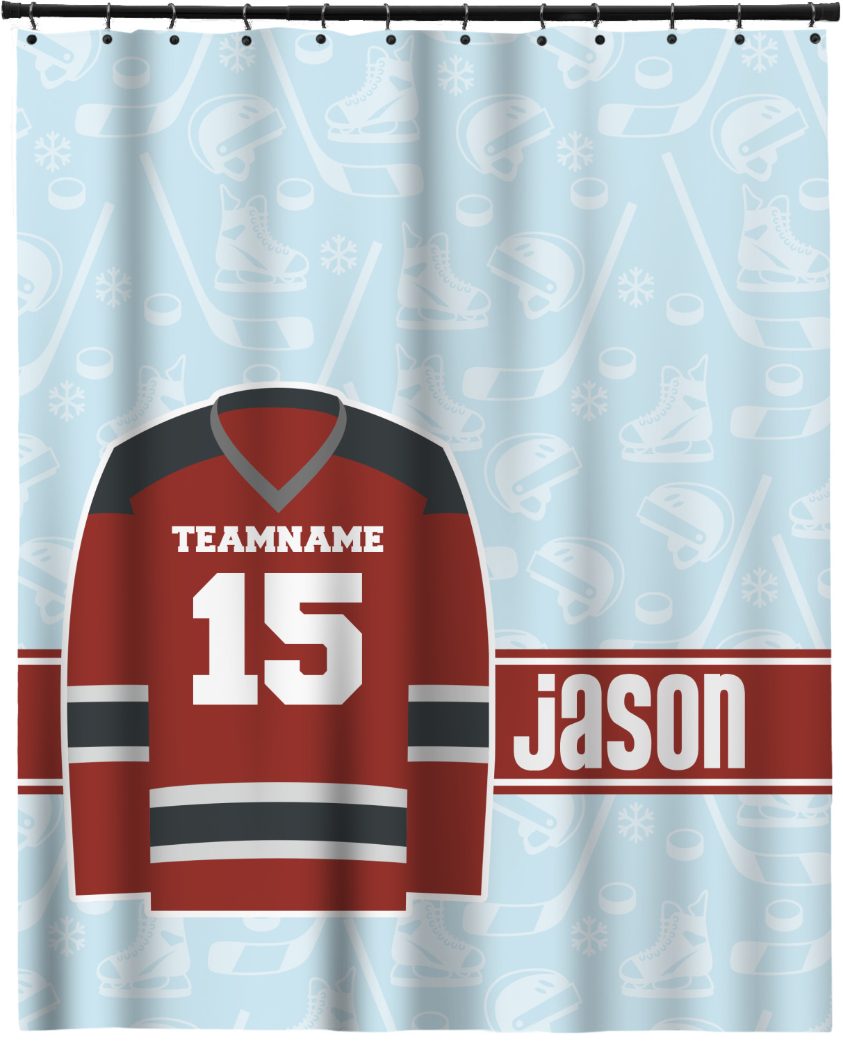 This design features a white background, reminiscent of ice, with hockey pucks repeating on it. The main design has a red hockey jersey in the foreground that can be customized with your favorite team's colors. This design perfect for any die-hard hockey fans!