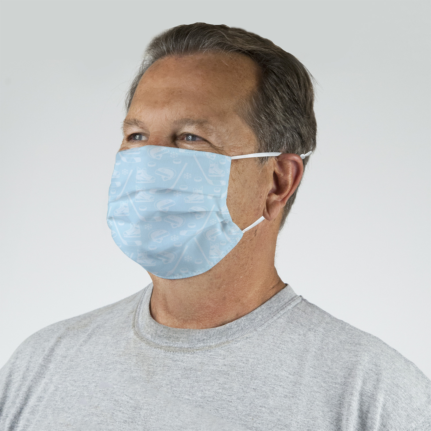 These fun face masks are 7" wide and 3.5" high. They feature pleats, adjustable ear loops, and are made with two layers of fabric. The top layer where your design is printed is a breathable polyester sheeting, while the inside layer is a soft microfiber polyester