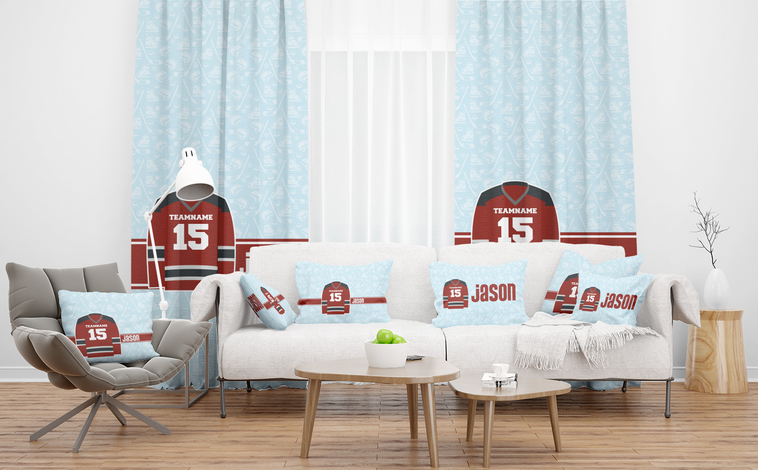 This design features a white background, reminiscent of ice, with hockey pucks repeating on it. The main design has a red hockey jersey in the foreground that can be customized with your favorite team's colors. This design perfect for any die-hard hockey fans!