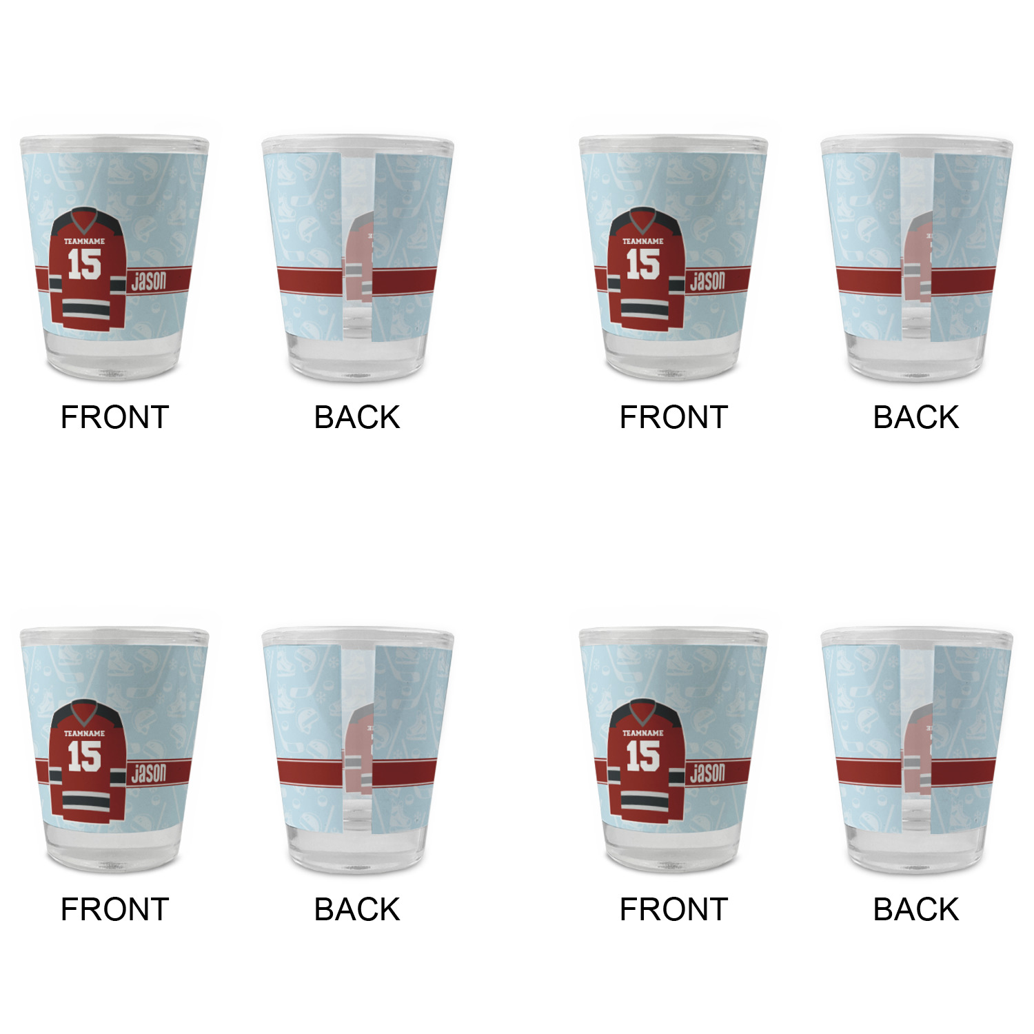 This design features a white background, reminiscent of ice, with hockey pucks repeating on it. The main design has a red hockey jersey in the foreground that can be customized with your favorite team's colors. This design perfect for any die-hard hockey fans!