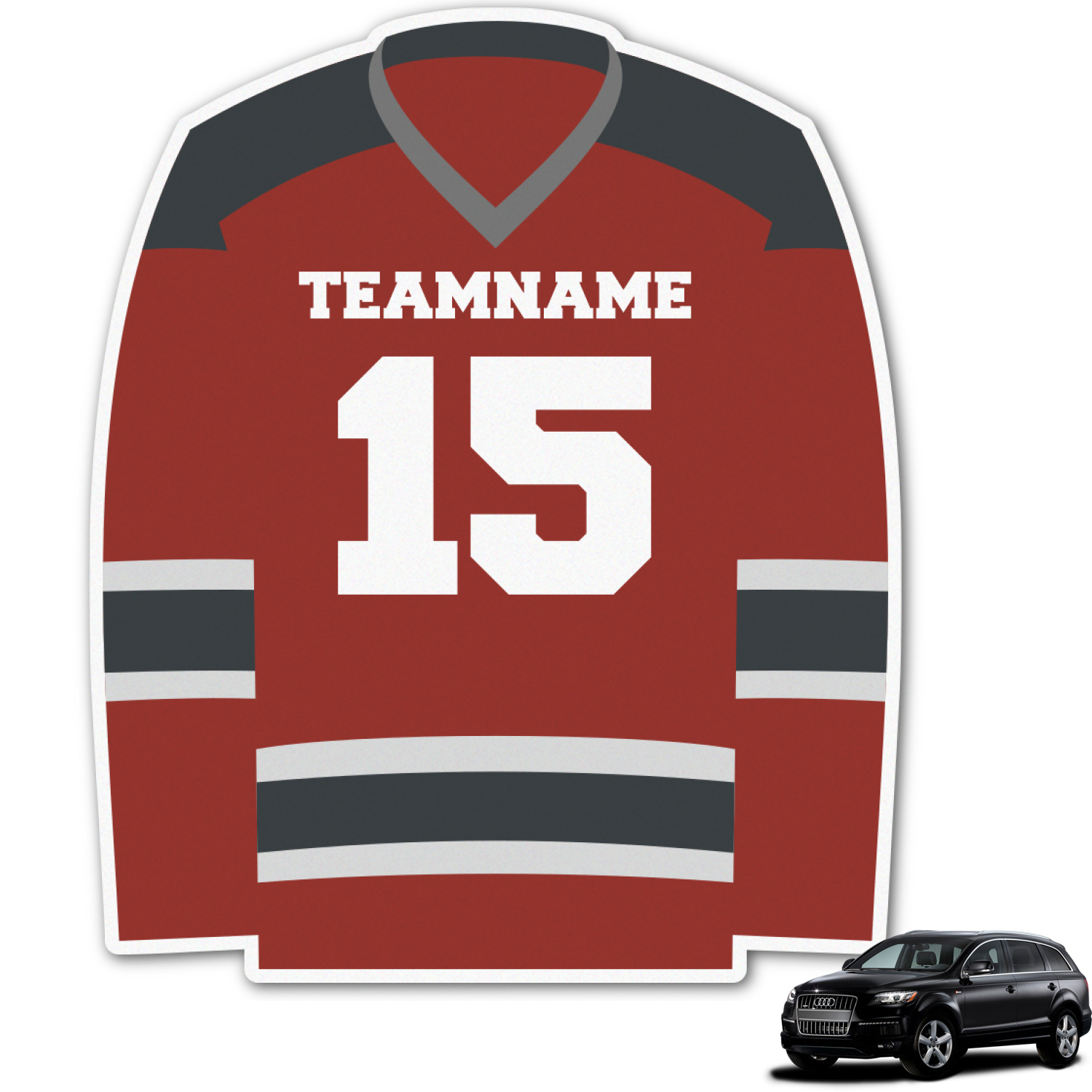 This design features a white background, reminiscent of ice, with hockey pucks repeating on it. The main design has a red hockey jersey in the foreground that can be customized with your favorite team's colors. This design perfect for any die-hard hockey fans!