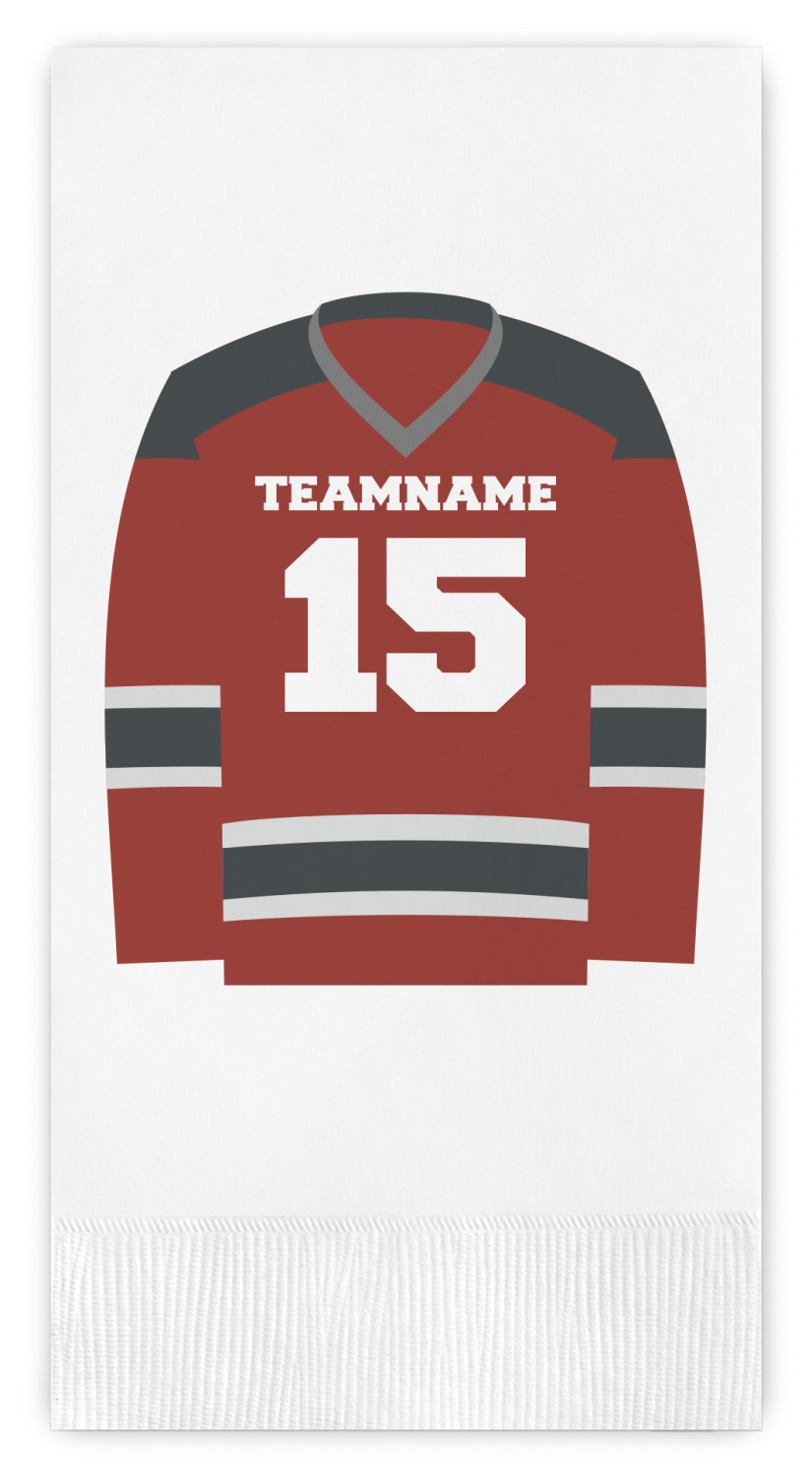 This design features a white background, reminiscent of ice, with hockey pucks repeating on it. The main design has a red hockey jersey in the foreground that can be customized with your favorite team's colors. This design perfect for any die-hard hockey fans!