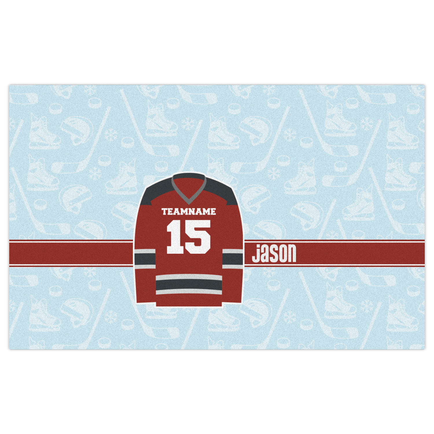 This design features a white background, reminiscent of ice, with hockey pucks repeating on it. The main design has a red hockey jersey in the foreground that can be customized with your favorite team's colors. This design perfect for any die-hard hockey fans!