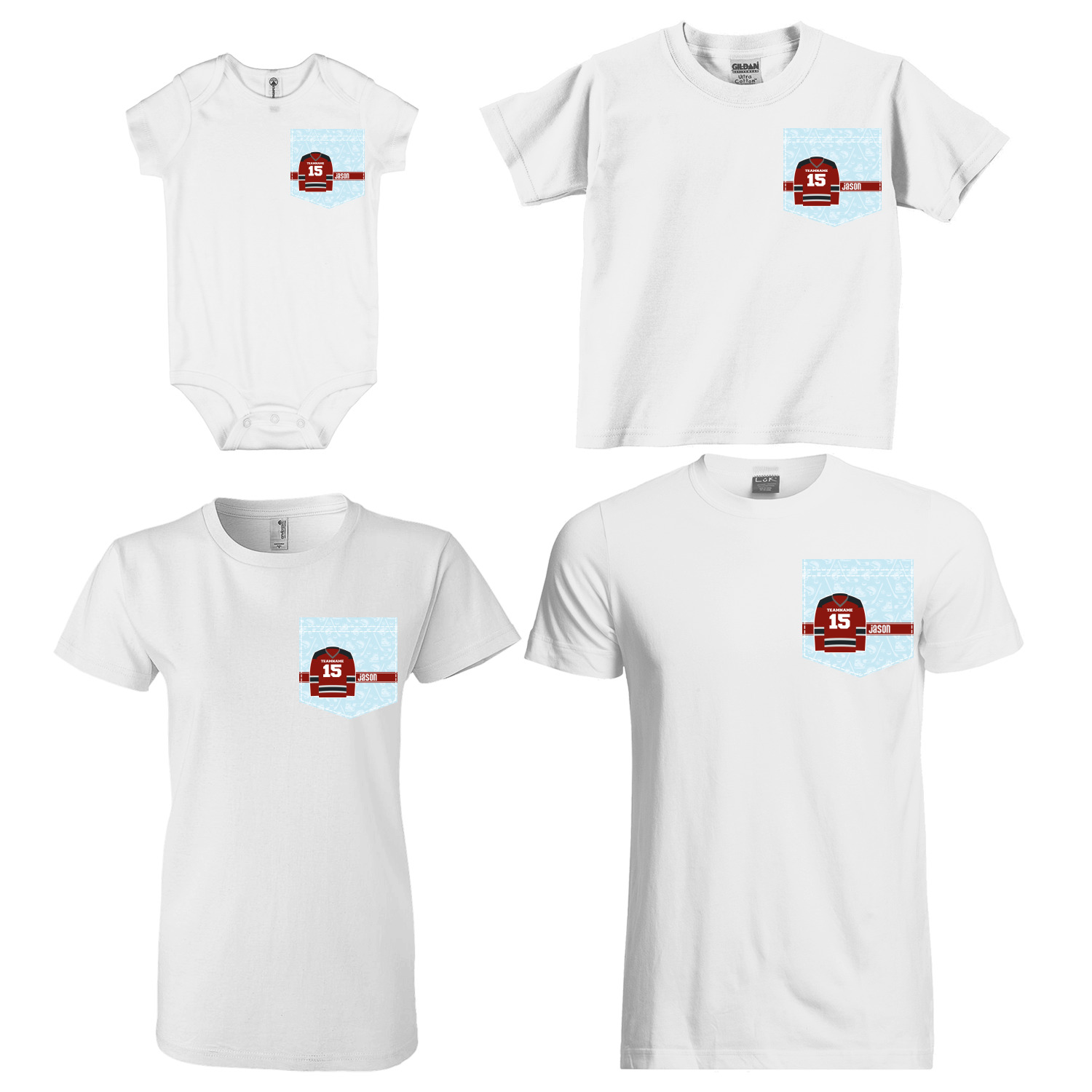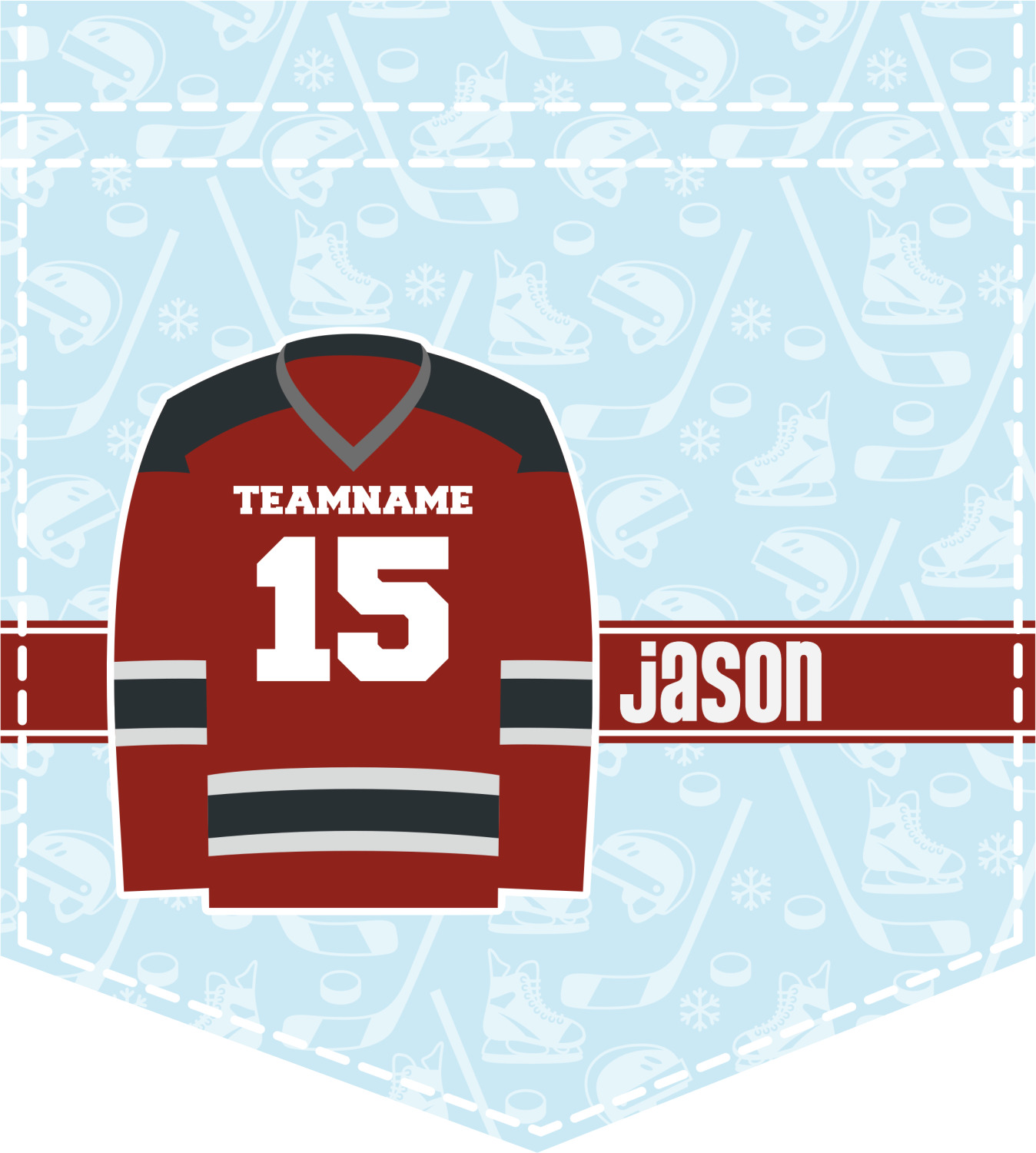 This design features a white background, reminiscent of ice, with hockey pucks repeating on it. The main design has a red hockey jersey in the foreground that can be customized with your favorite team's colors. This design perfect for any die-hard hockey fans!