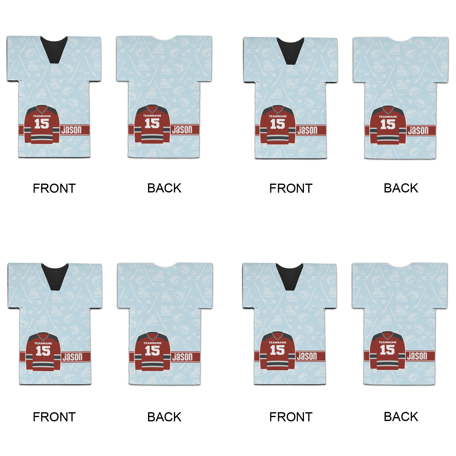 This design features a white background, reminiscent of ice, with hockey pucks repeating on it. The main design has a red hockey jersey in the foreground that can be customized with your favorite team's colors. This design perfect for any die-hard hockey fans!