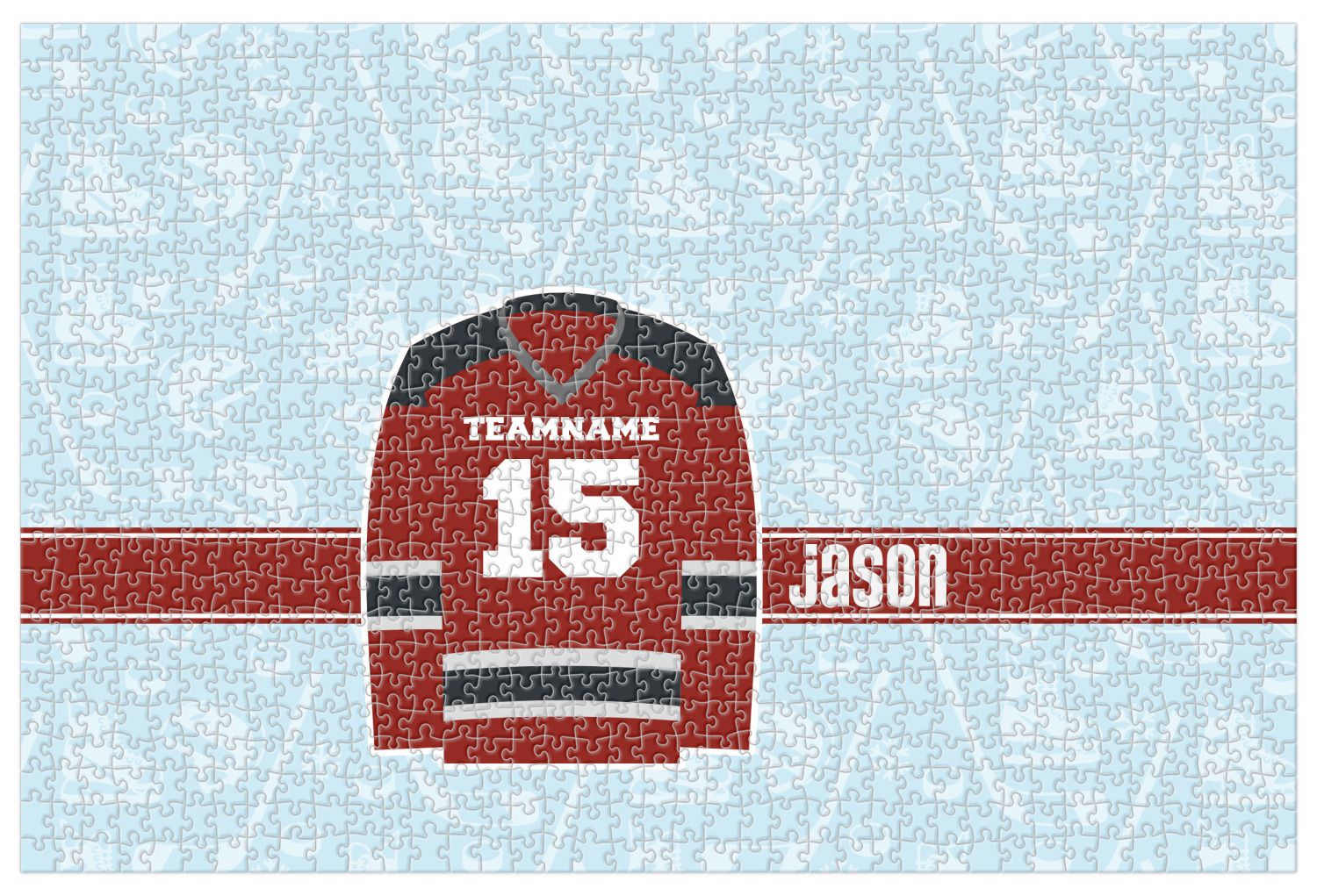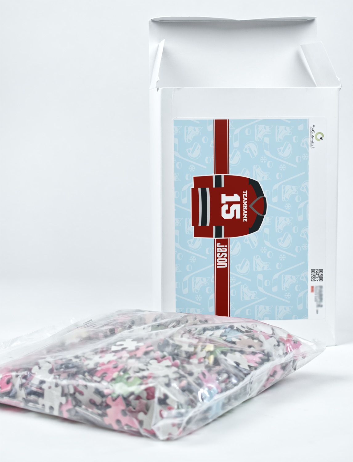 This design features a white background, reminiscent of ice, with hockey pucks repeating on it. The main design has a red hockey jersey in the foreground that can be customized with your favorite team's colors. This design perfect for any die-hard hockey fans!