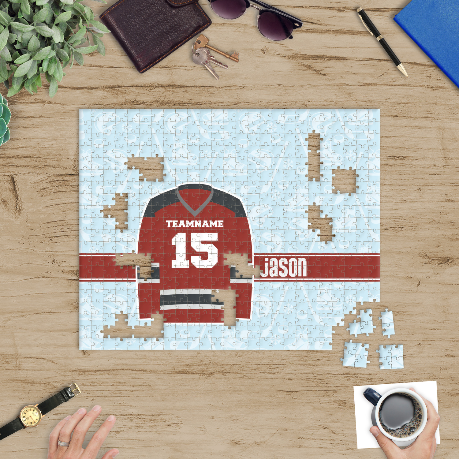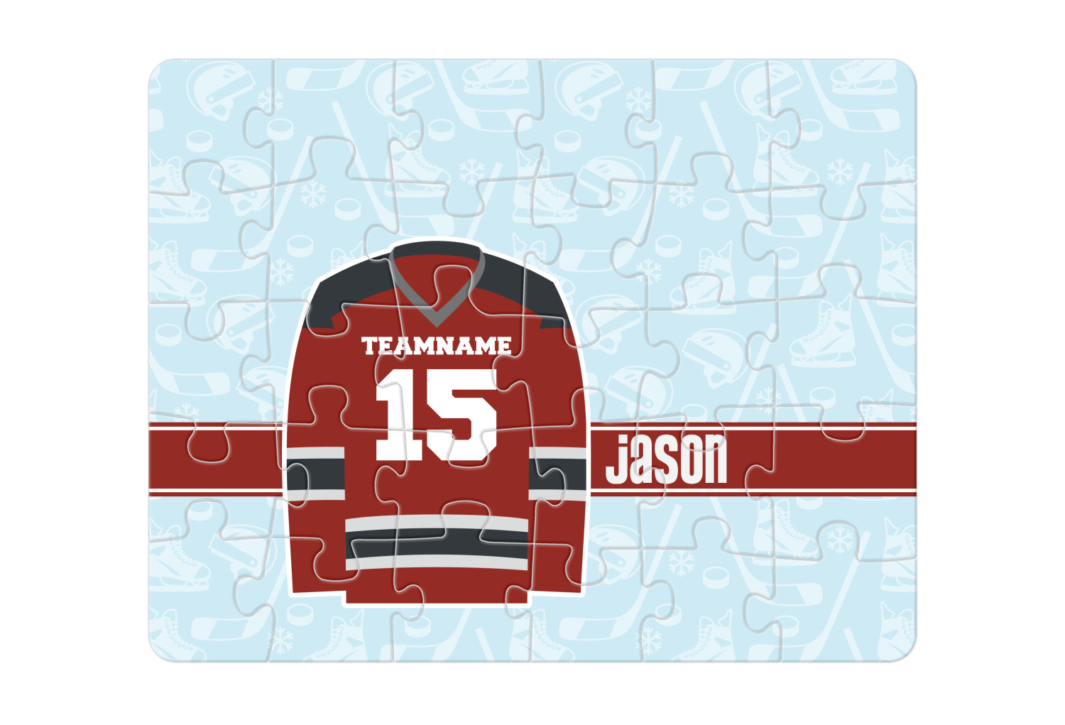 This design features a white background, reminiscent of ice, with hockey pucks repeating on it. The main design has a red hockey jersey in the foreground that can be customized with your favorite team's colors. This design perfect for any die-hard hockey fans!