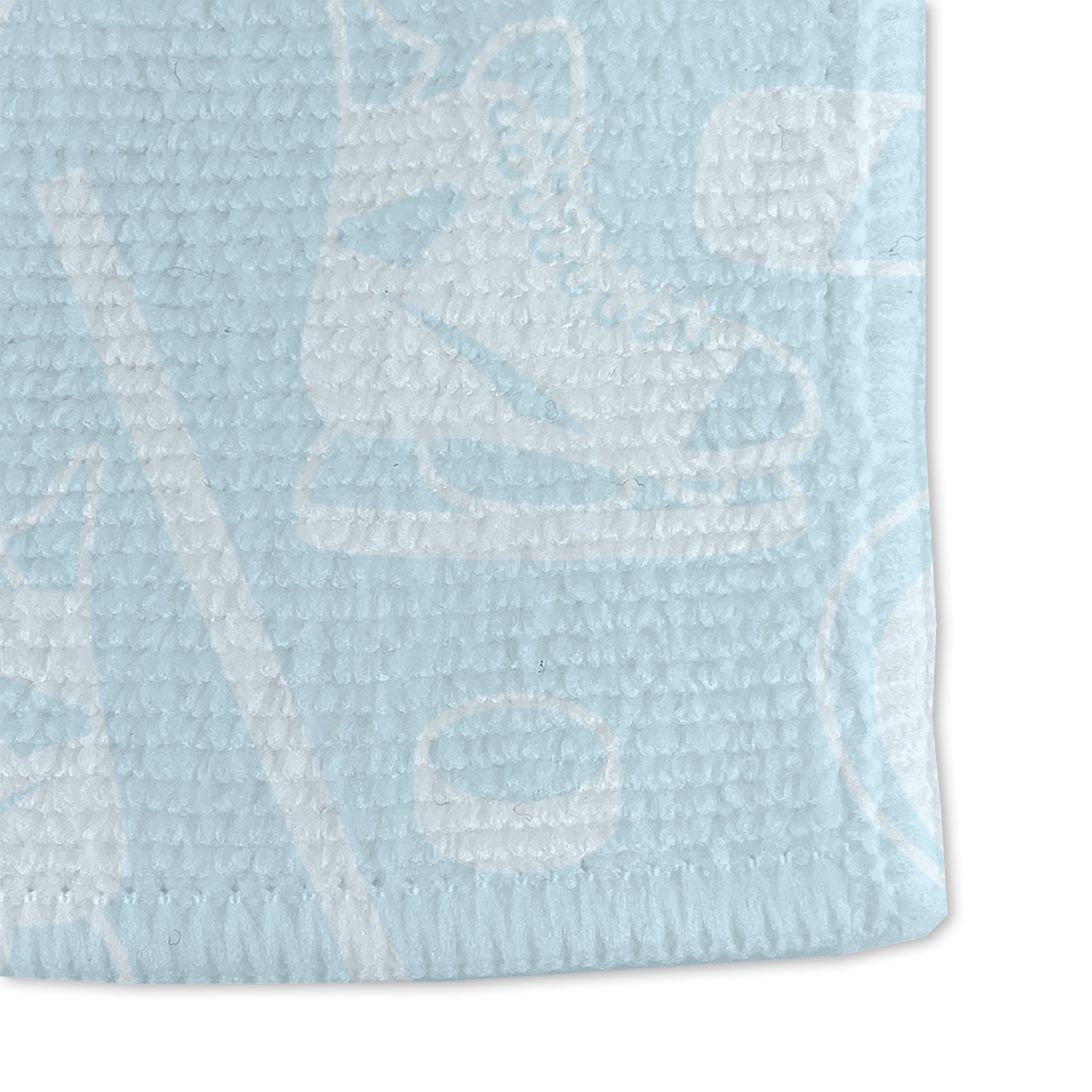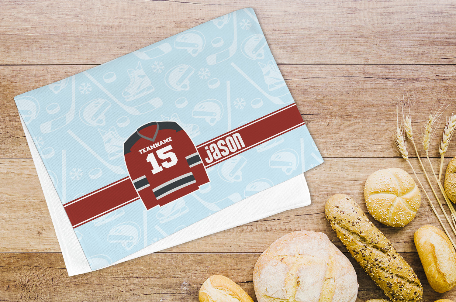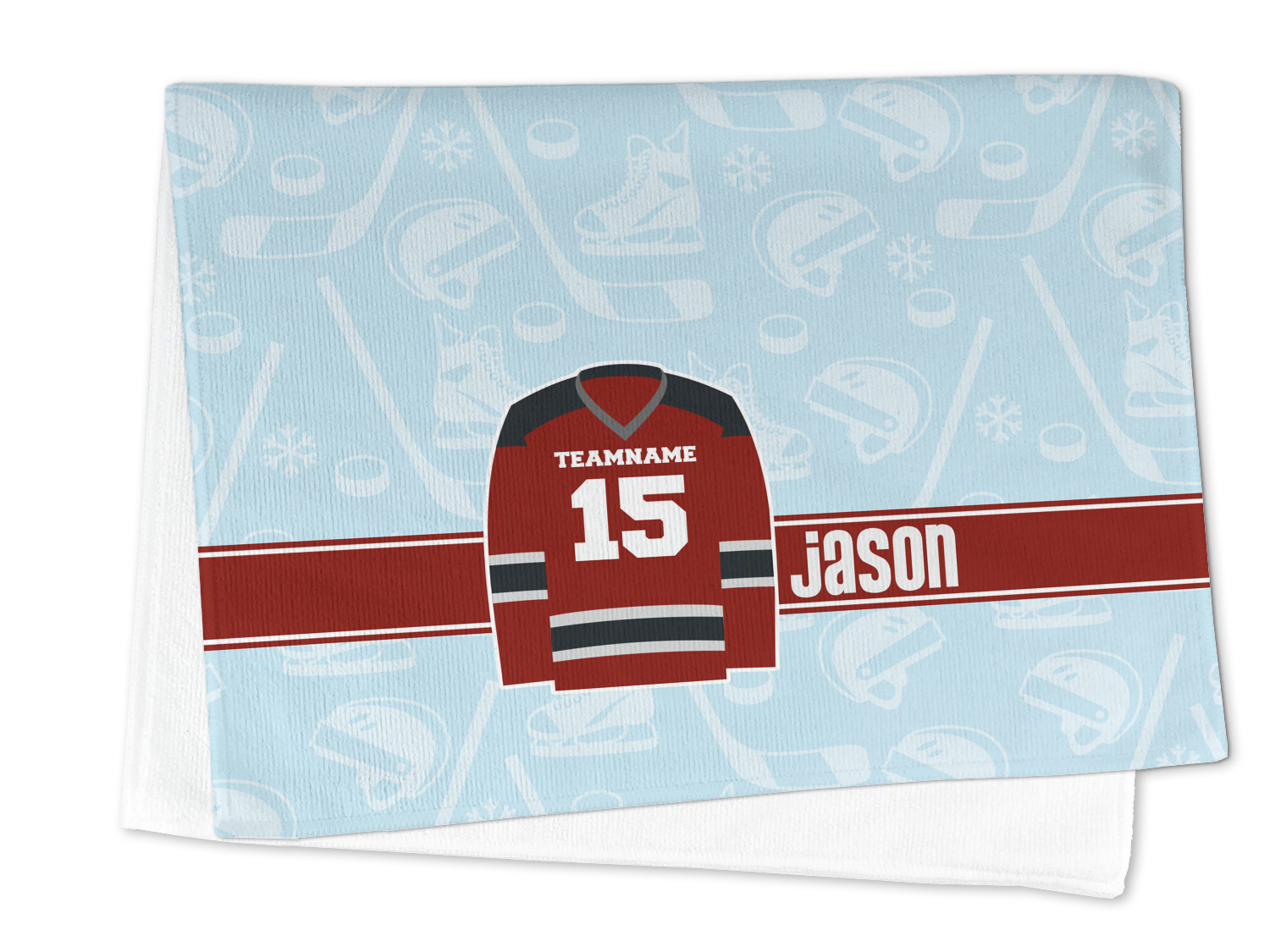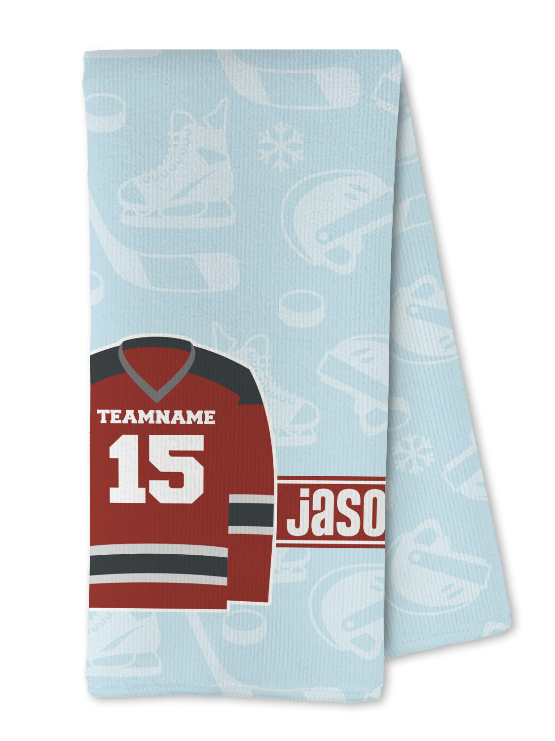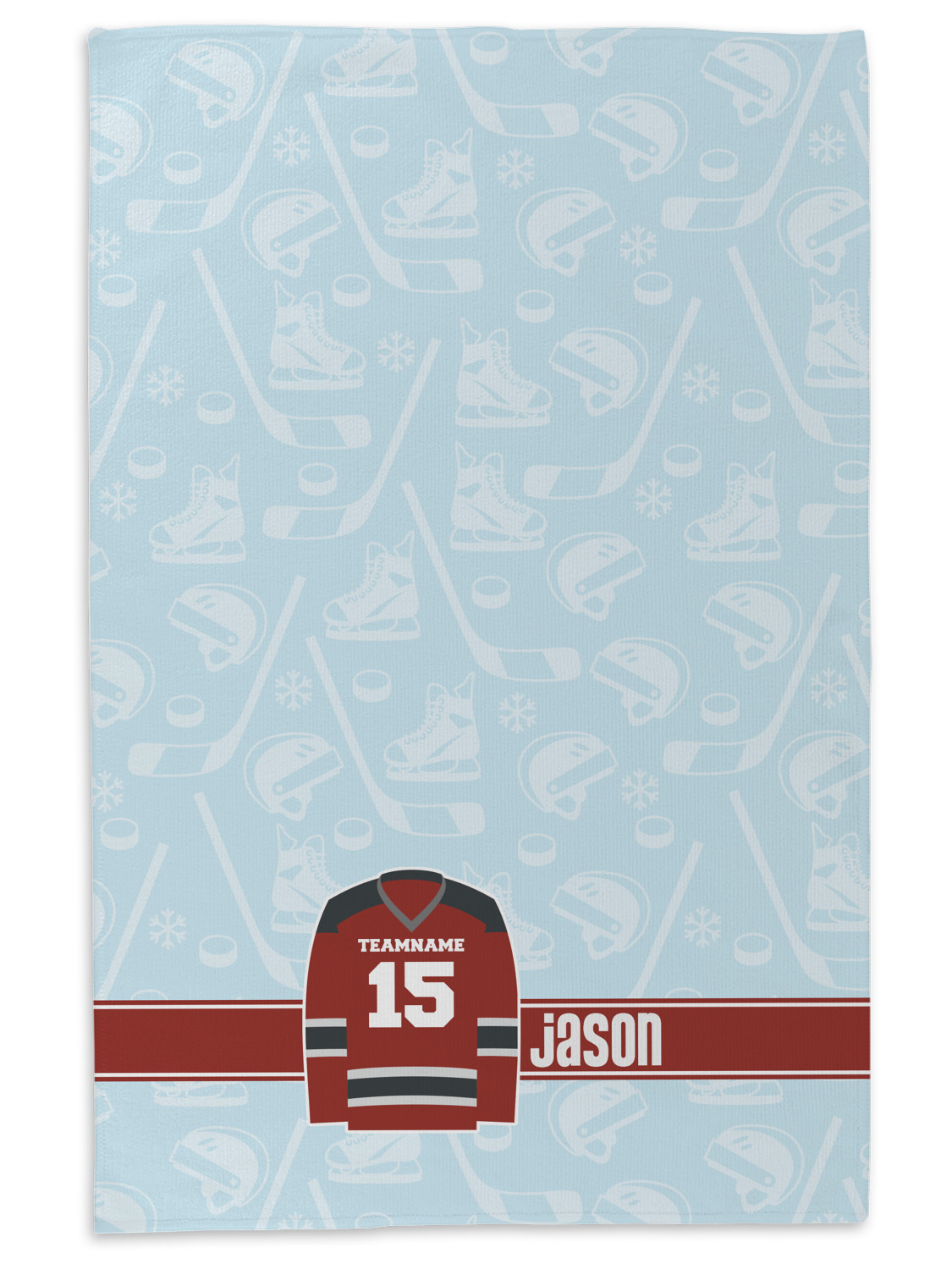 This design features a white background, reminiscent of ice, with hockey pucks repeating on it. The main design has a red hockey jersey in the foreground that can be customized with your favorite team's colors. This design perfect for any die-hard hockey fans!