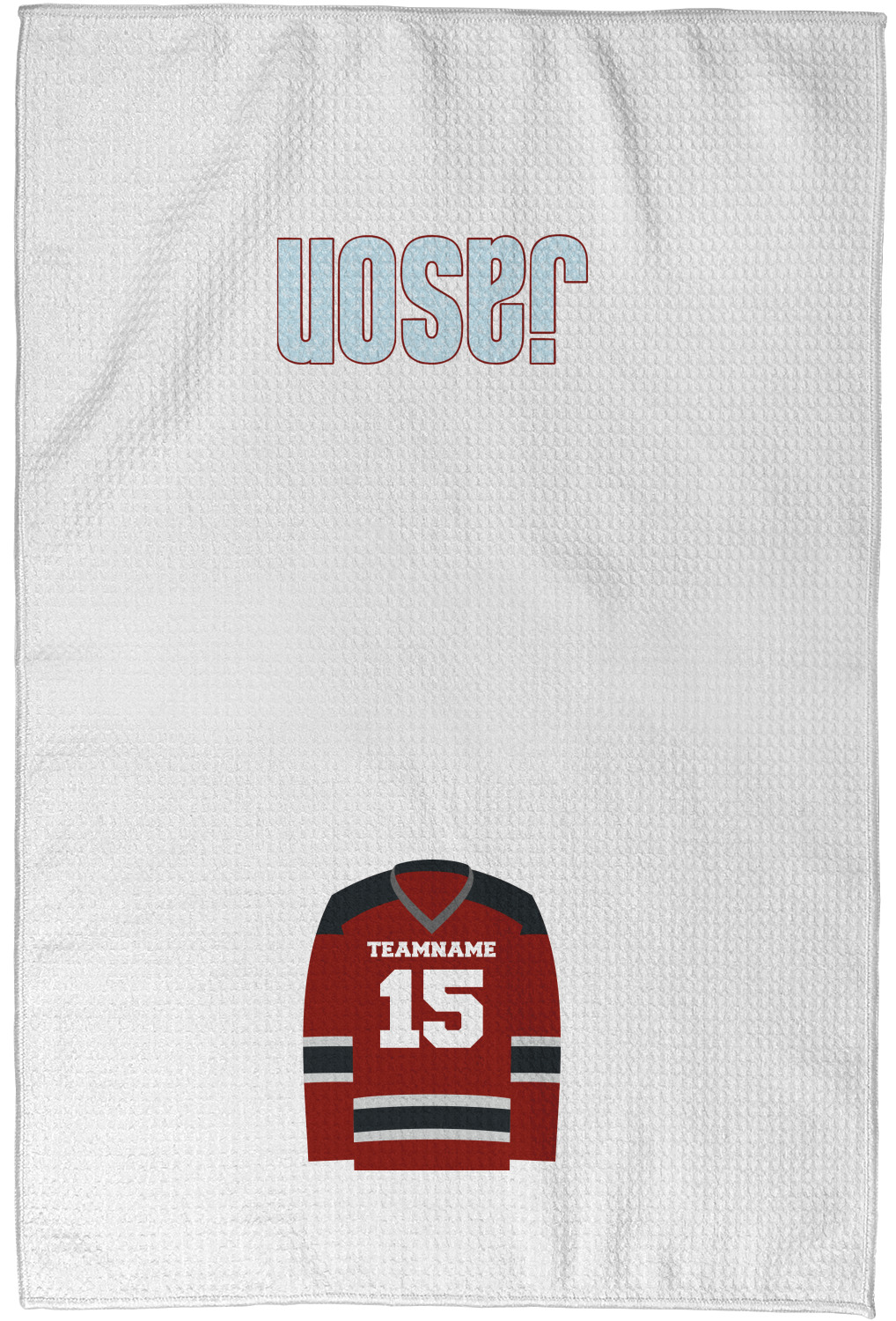 This design features a white background, reminiscent of ice, with hockey pucks repeating on it. The main design has a red hockey jersey in the foreground that can be customized with your favorite team's colors. This design perfect for any die-hard hockey fans!