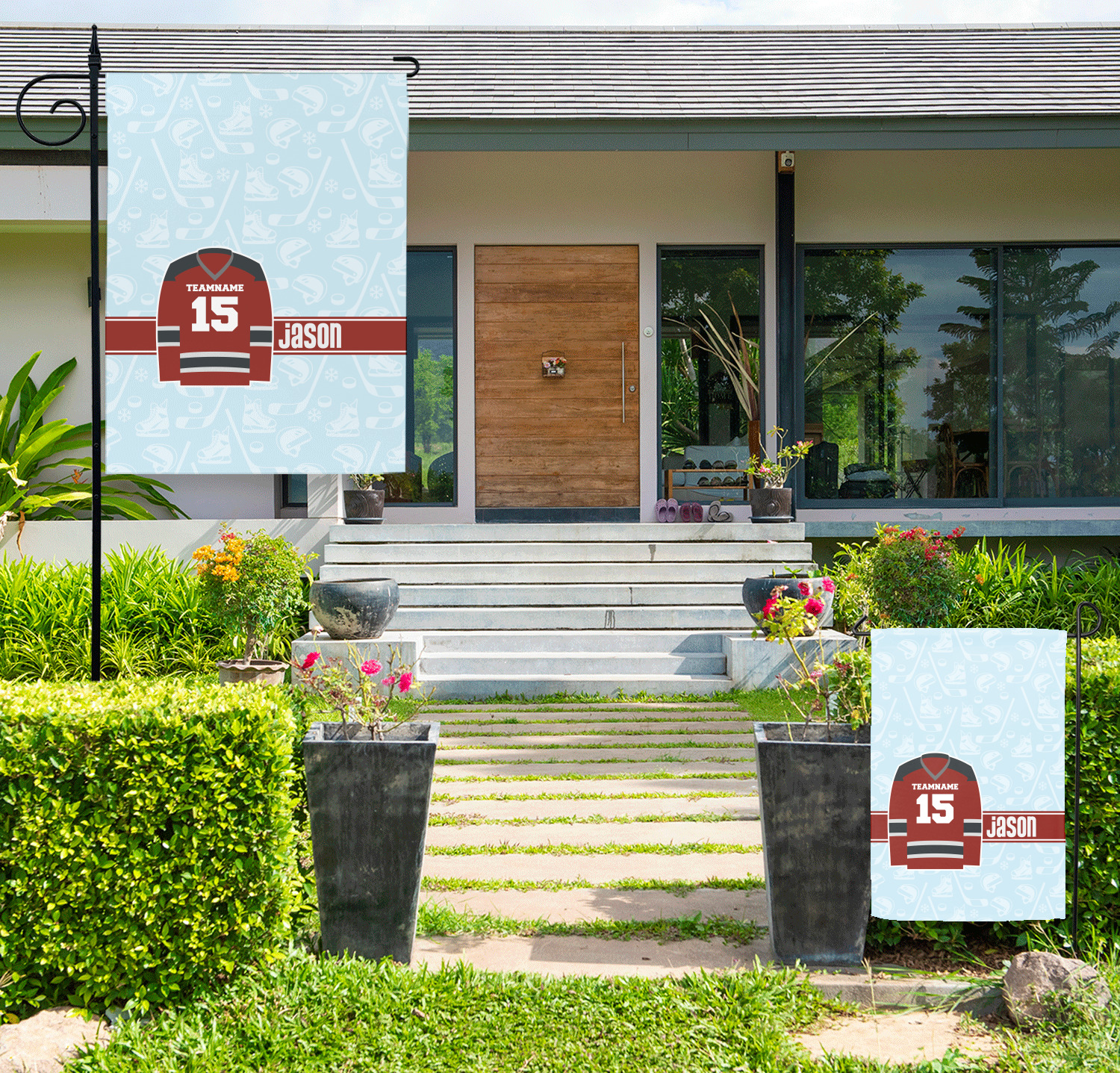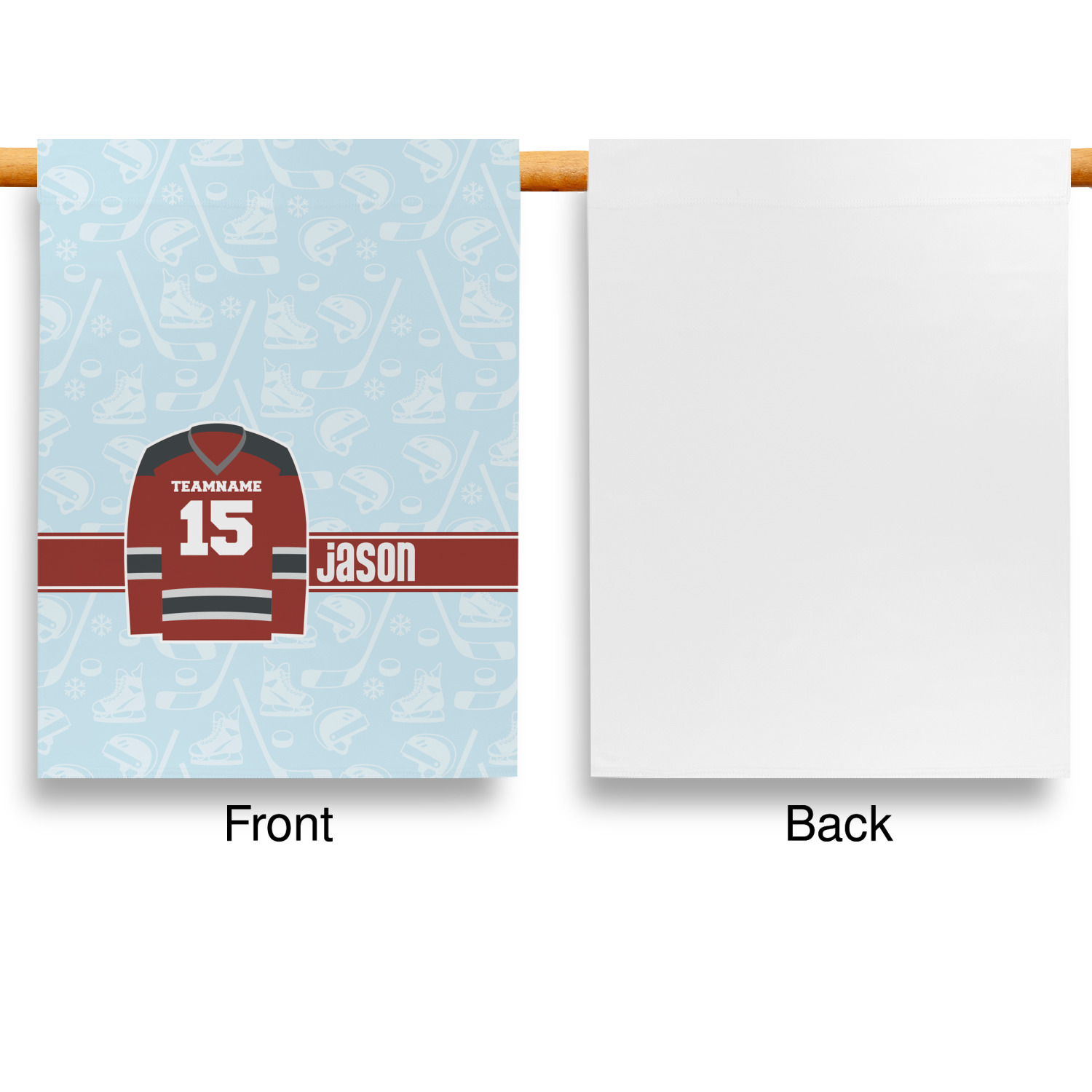 This design features a white background, reminiscent of ice, with hockey pucks repeating on it. The main design has a red hockey jersey in the foreground that can be customized with your favorite team's colors. This design perfect for any die-hard hockey fans!